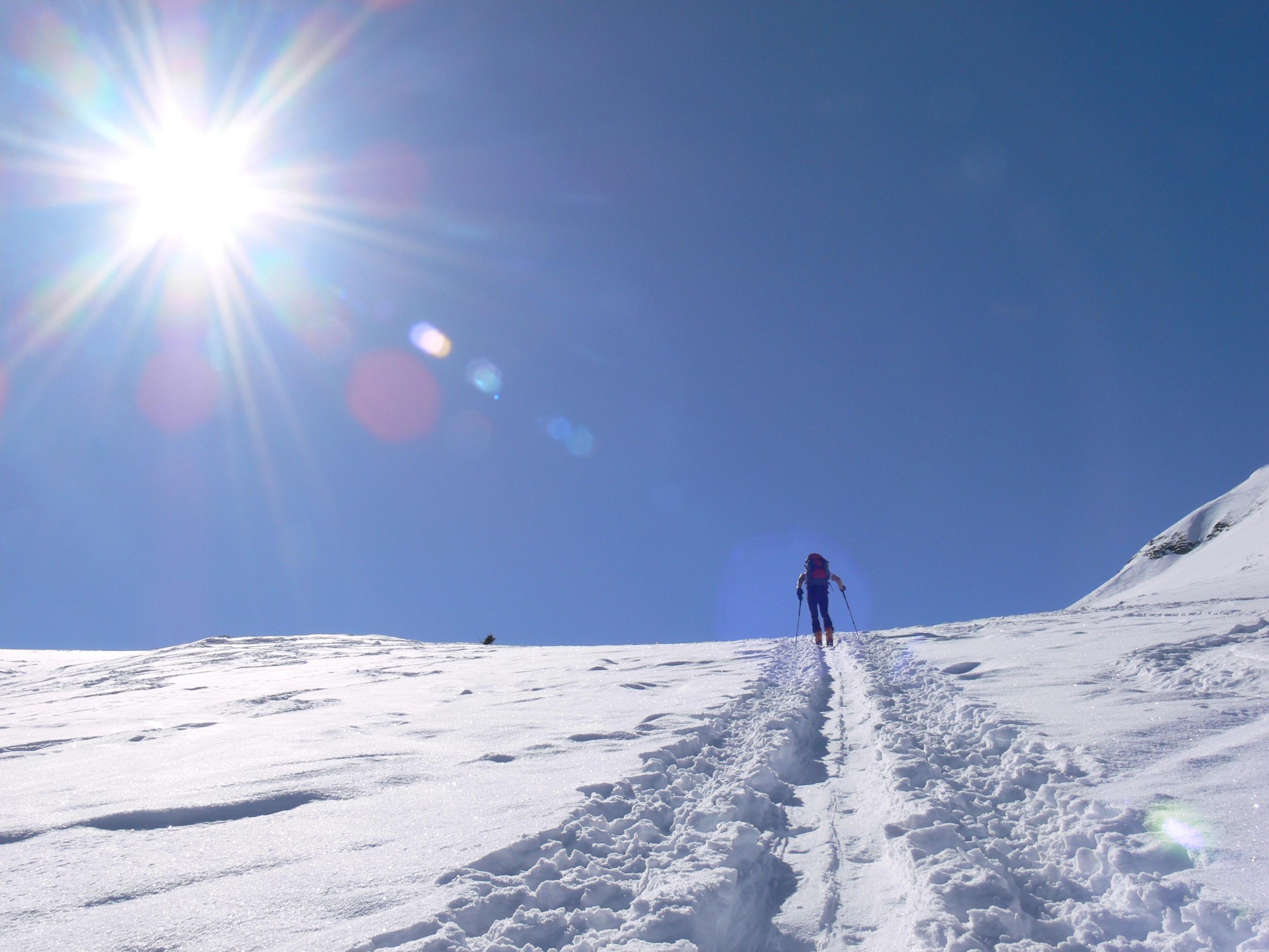 Die Breite des Gipfelhanges würde auch noch für Dutzend weitere Tourengeher unverspurte Bereiche bieten (heute haben nicht sehr viel hier herauf gefunden :-))