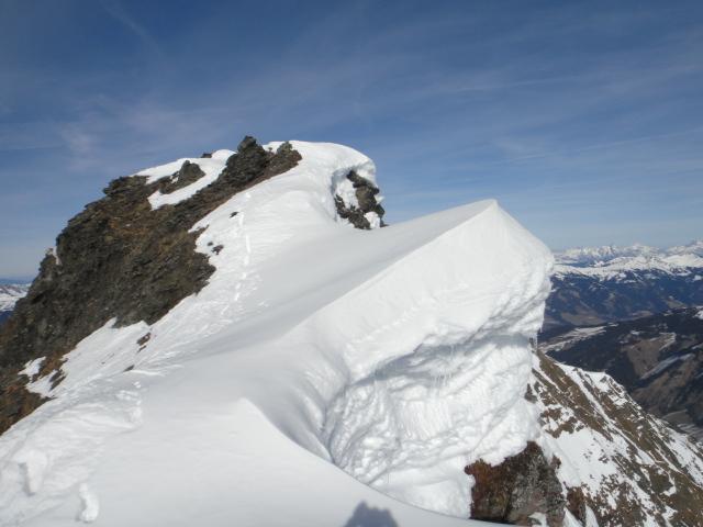 Günstige Verhältnisse im Hollersbachtal: Der Wind hat überall soviel Schneedecke übrig gelassen, dass bis zum Talboden abgefahren werden kann. Die Staße kann taleinwärts zu Fuß wie am Schotterweg begangen werden. Aufgrund der nur kurzen Sonneneinstrahlung bleibt der Schnee auf der Straße gefroren und talauswärts ist die Abfahrt mit Ski bestens möglich. In den NW-Hängen vom Leiterkogel runter ist noch pulvriger Schnee, ein Hochgenuss im Vergleich zu den Windgangeln in letzter Zeit. Am Grat zum Gipfel abwechselnd Blockwerk und trittfester Schnee.