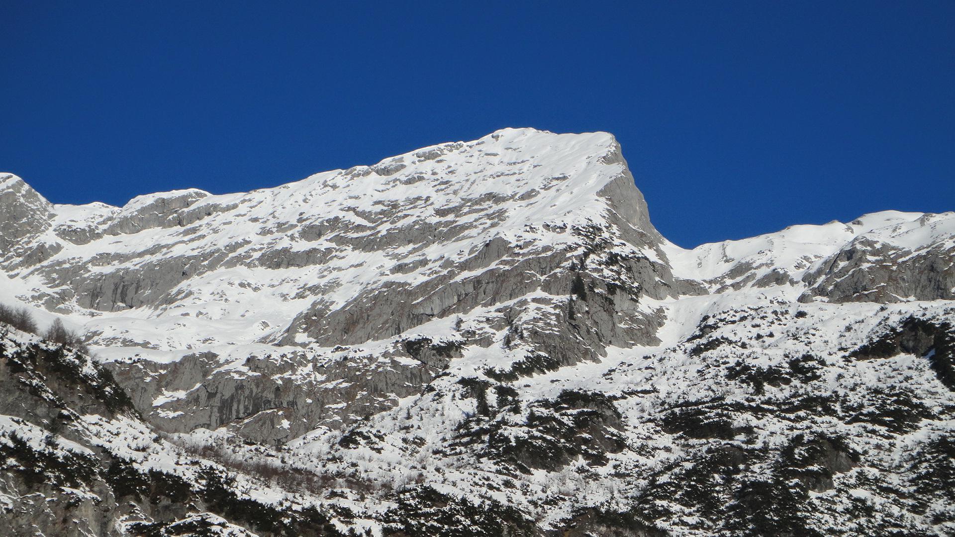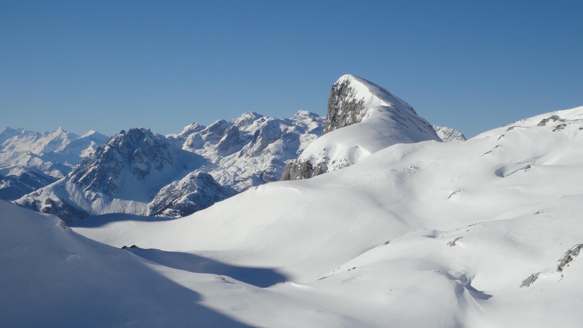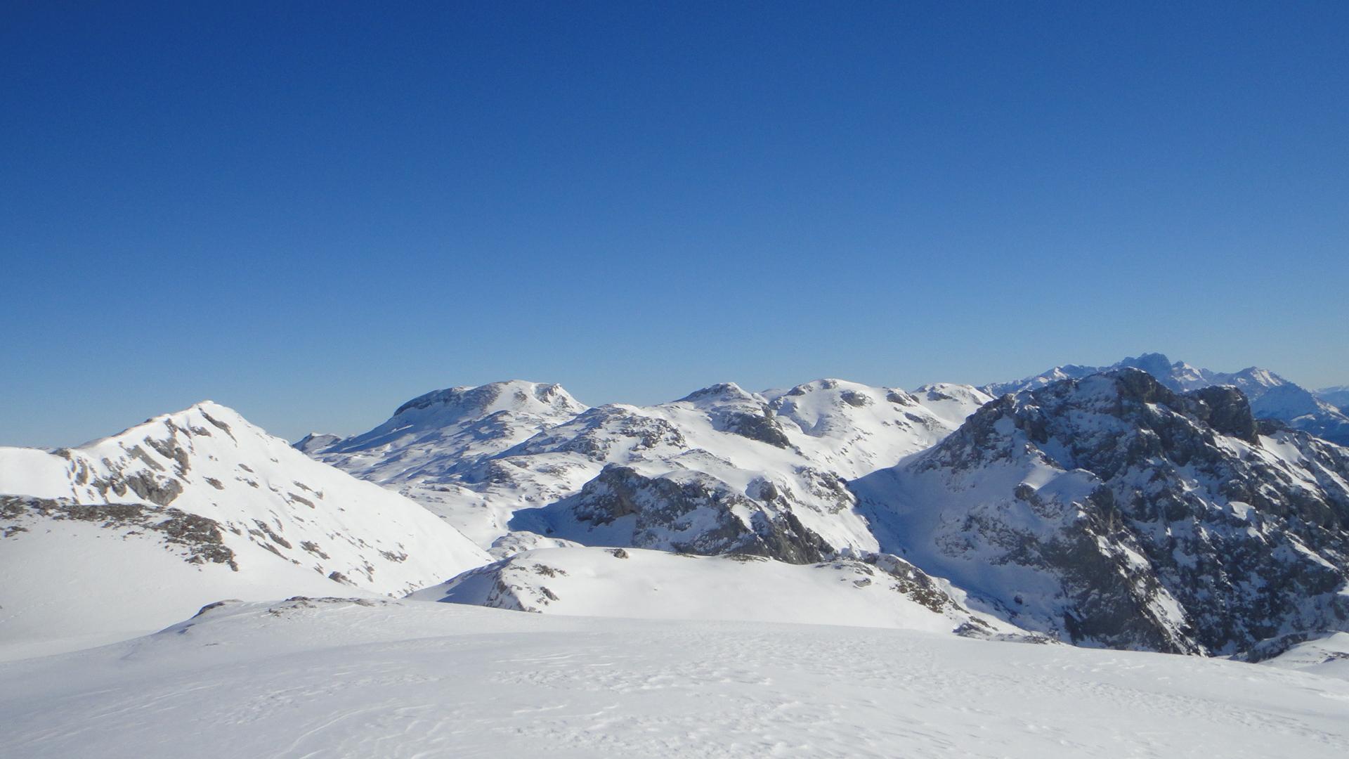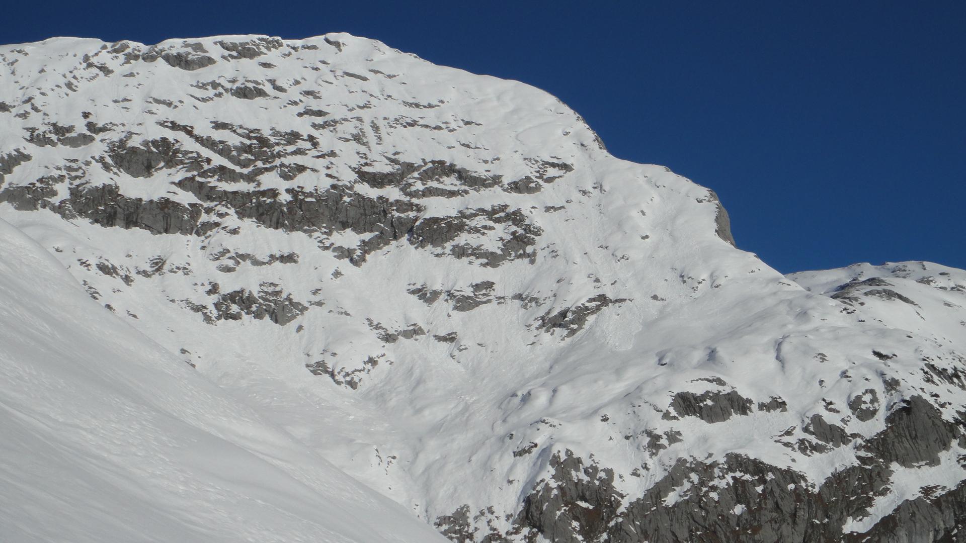 Der Steig im Aufstieg geht gut über feste Schneestapfen. Die Temperaturen waren ein ziemliches Wechselspiel: saukalt in der Früh, richtiges Schwitzen in den Südhängen zum Trog und eine kalte Brise von Nord am Plateu. Die innere Anspannung vor der Steilabfahrt stieg: wird die S-Flanke durch die Sonneneinstrahlung aufgefirnt oder durch den kalten Wind noch bockhart sein? Um 11:50 war es optimal aufgefirnt (günstiges Zeitfenster ca. 11:30 bis 13:00) und die Befahrung der gut 40° steilen und 400hm langen Flanke ein prickelnder Genuss. Der abschließende Schneiderleitensteig war unschwierig aber mühselig.