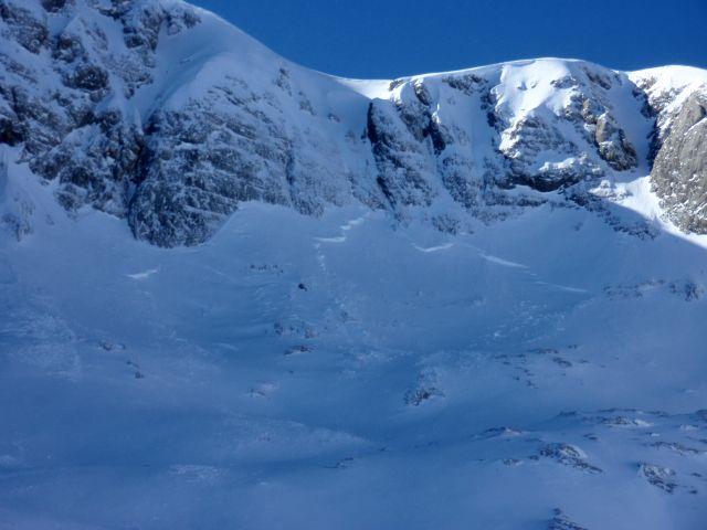 Bereits aus der Zirbn-Grube waren zwei Anrisse von Schneebrettern zu erkennen. Eines unterhalb des Niederen Kreuzes, NW-lich vom Schöberl und das Zweite unterhalb des Hohen Ochsenkogels. Beide Anrisse nahe am Wandfuß im recht steilen Gelände und verm. viel Schnee der über die Wände in die schattigen Hänge herabgerieselt ist.