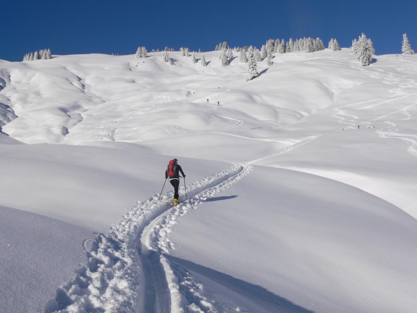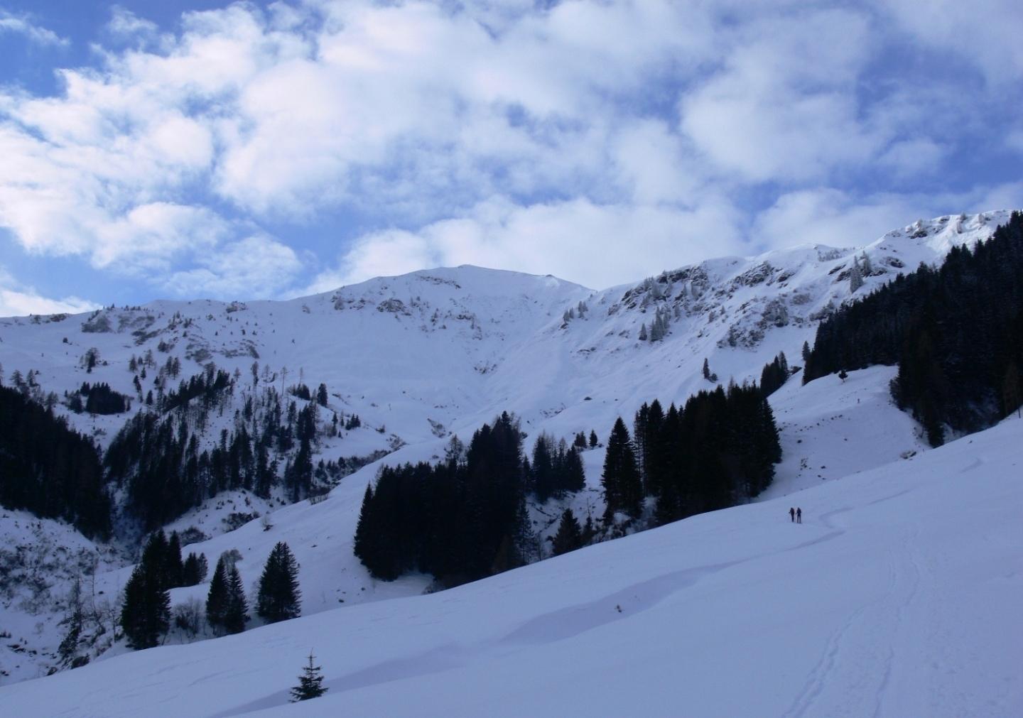 Abfahrtsbedingungen: wie schon Albrecht Seer treffend formuliert hat: tragender, jedoch zum Teil schon stark zerfahrener Harsch, mit einer vom Wind bereits wieder stark bearbeiteten bzw. verfrachteten Neuschnee-Auflage (ca. 10-20cm). Wir hatten hier schon bessere Bedingungen …