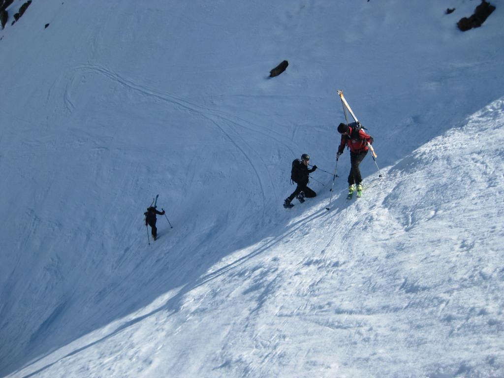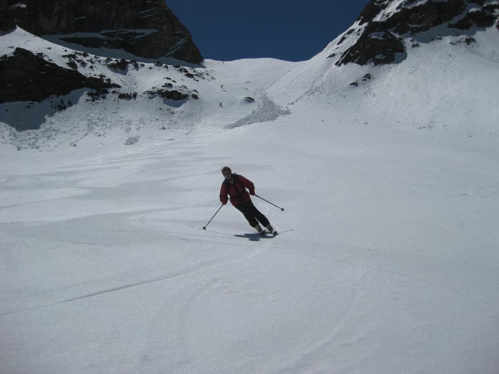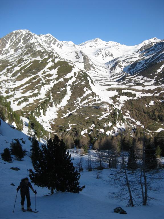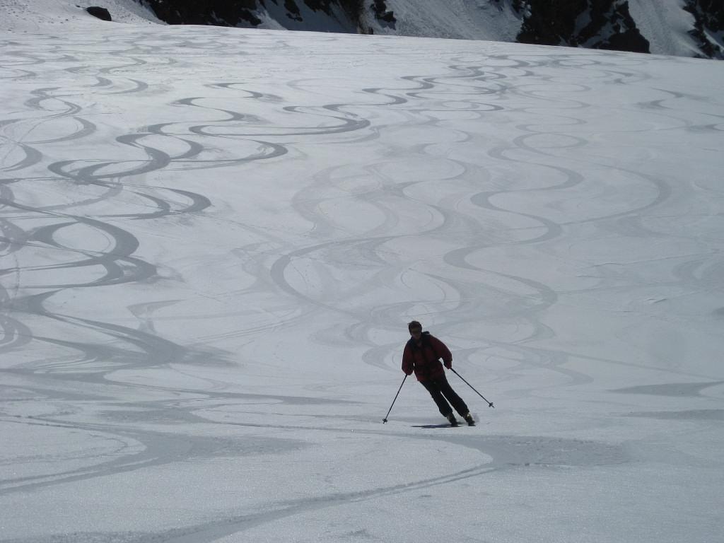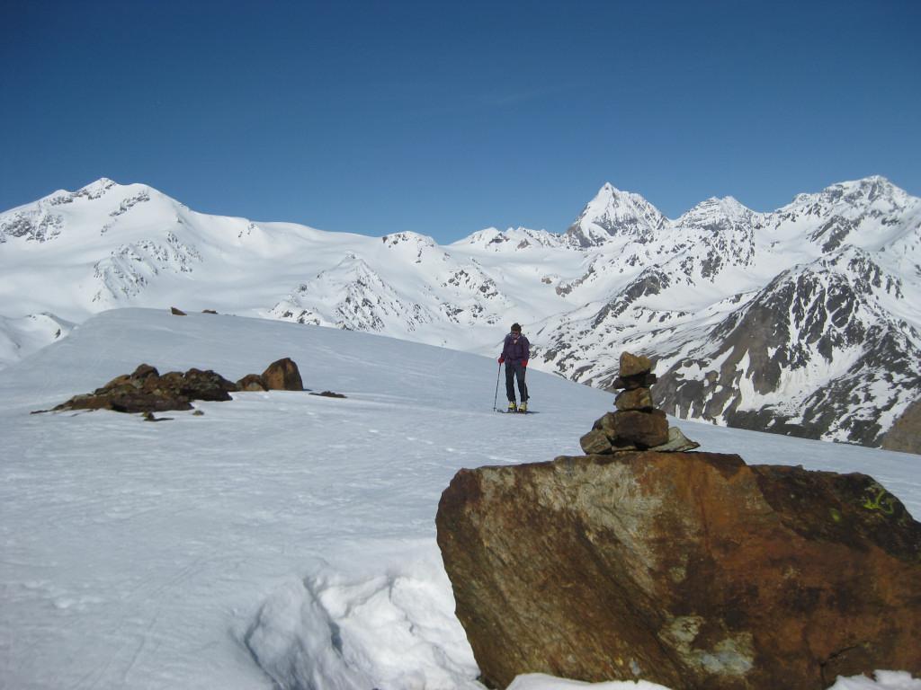 Durchgefrorene Schneedecke morgens, gegen Mittag ideales Auffirnen, Spalten am Schranferner geschlossen, leicht sulzig im Waldstück unterhalb der Zufallhütte.