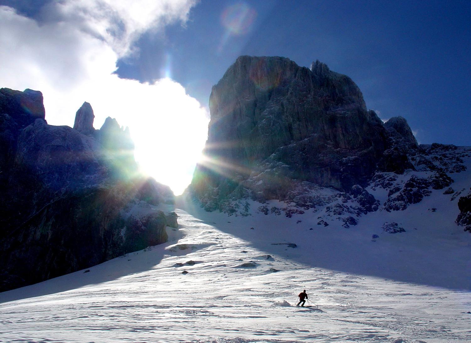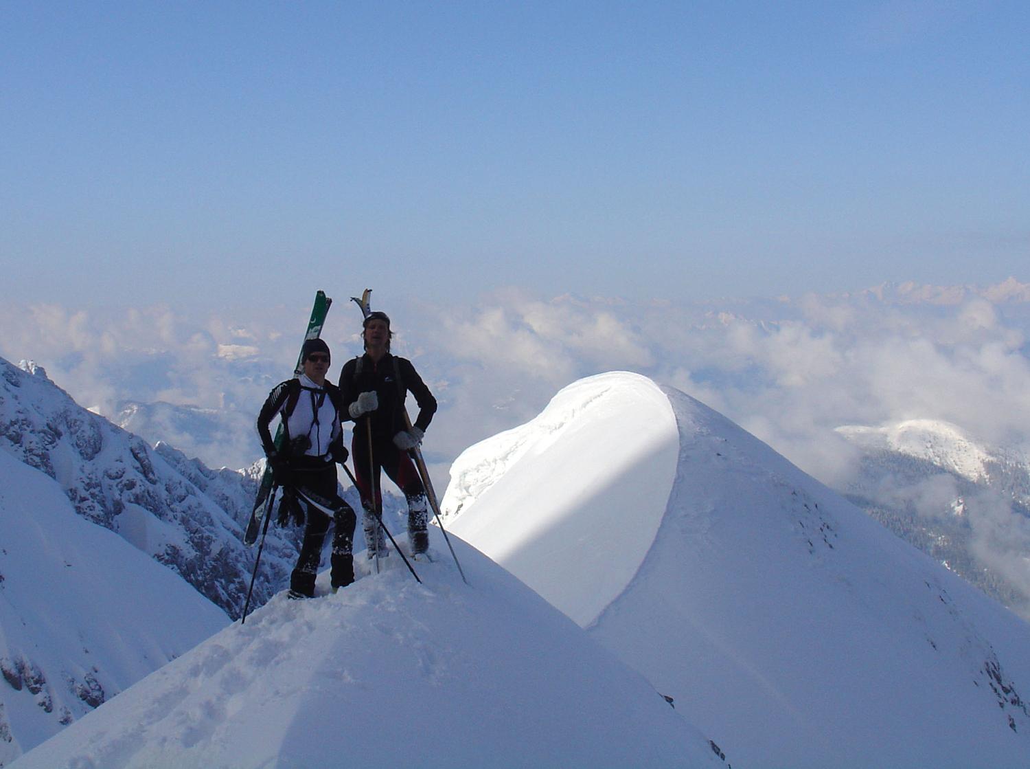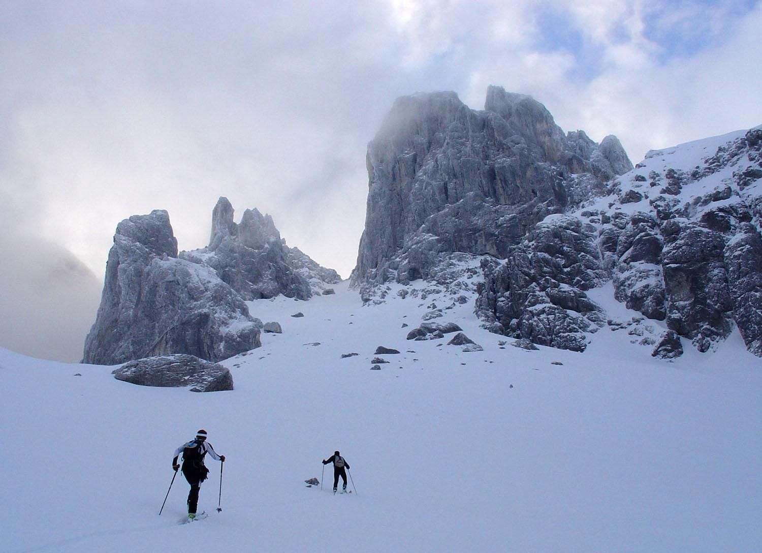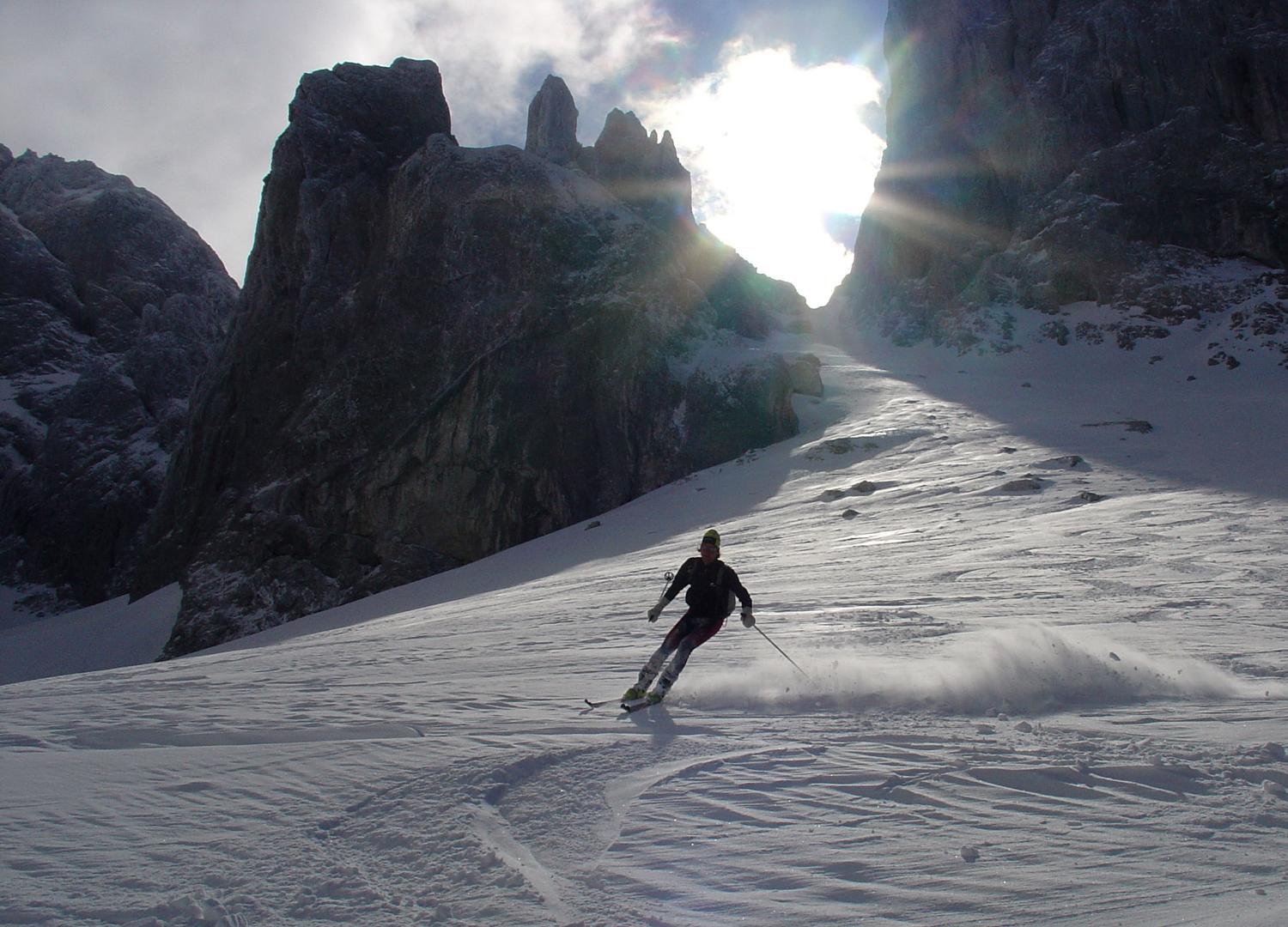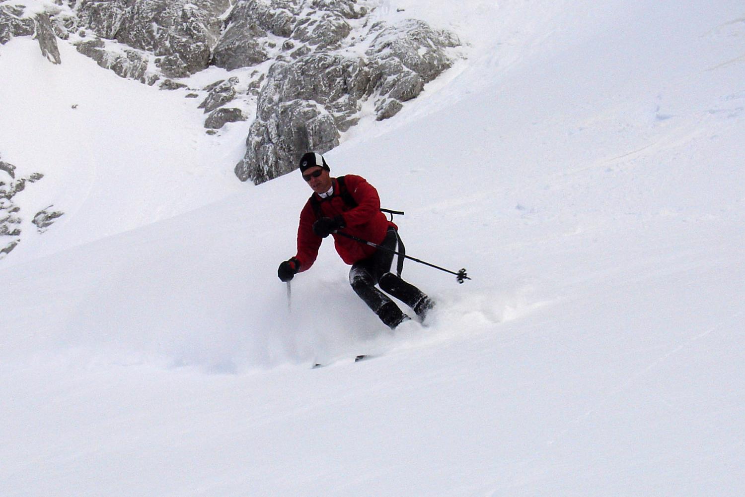 In aller Früh mit Hartmut und Willy vom Pommer über die Lochalm ins Stuhlloch. Ca. 100 m oberhalb des Südsattels kehrten wir um. In diesem NW-Hang war ein mächtiges Schneebrett angeweht und zwischen Altschneedecke und dem Neuschnee eine 3 cm Graupelschicht. Als Ersatz spurten wir nach der Pulverabfahrt Richtung Obere Stuhllochscharte, aber in Nordwandhöhe mussten wir wegen kritischer Schneebrettverhältnisse wiederum umkehren. Der Neuschnee war teilweise windverblasen, ging jedoch gut zu fahren. Die Schattenhänge bleiben in allen Bereichen, wo diese Graupelschicht drin ist, bestimmt auch morgen noch kritisch ( Stufe 3 )