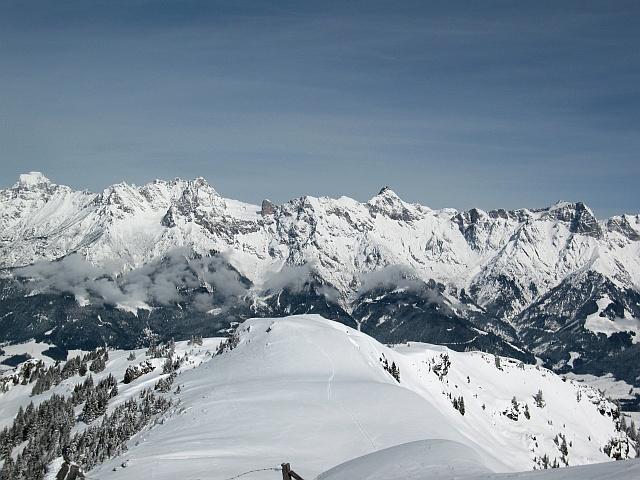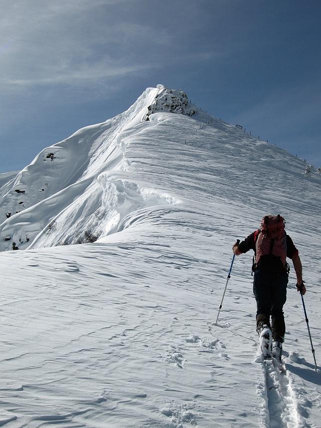 Schneeverhältnisse: im unteren Bereich schon etwas angefeuchtet, später Pulver und das letzte Stück zur Schwalbenwand abgeblasen. Am Gipfel NW-Wind.