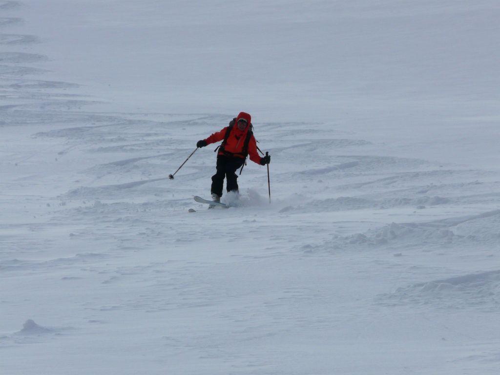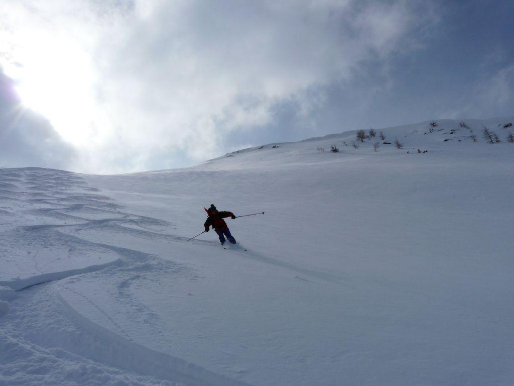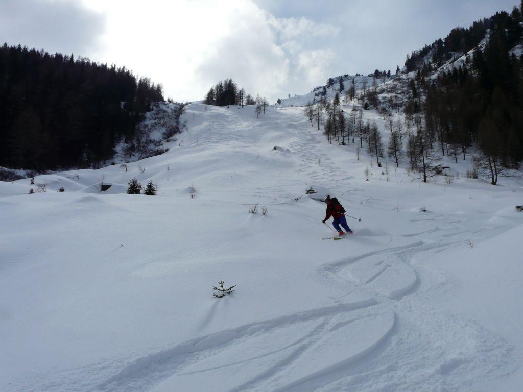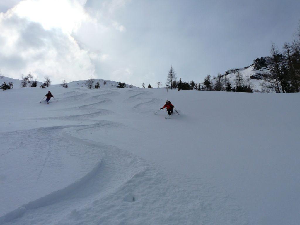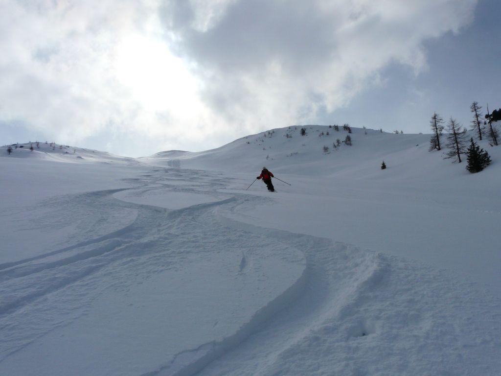 Trotz allem gemütliche Tour mit unverspurter Traumabfahrt - über 1500m Höhe 30-50cm Pulver auf tragfähigem Harschdeckel, der offenbar ohne Windeinfluß gefallen ist und bisher auch durch den heute stürmischen Wind wenig beeinflußt wurde.
