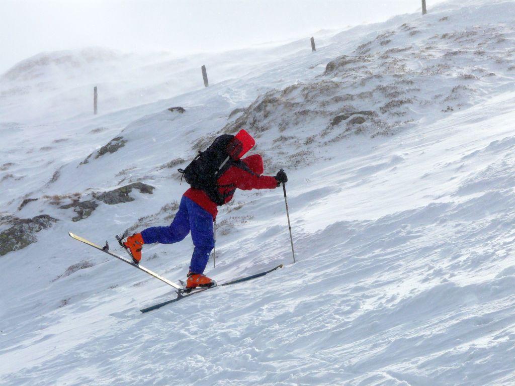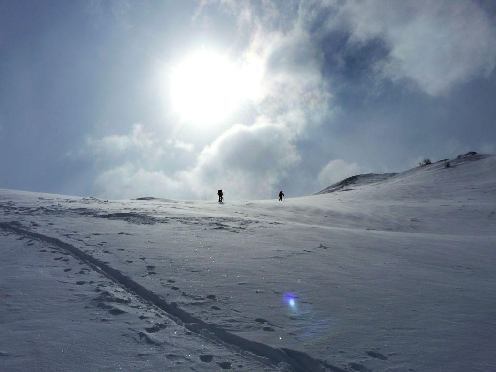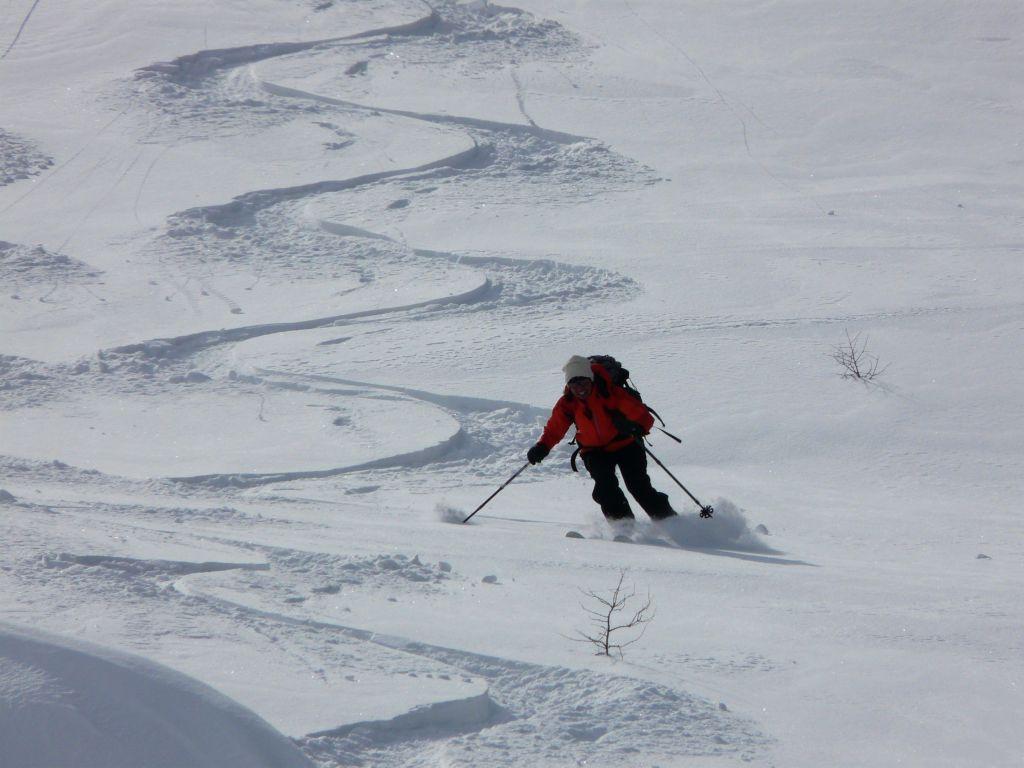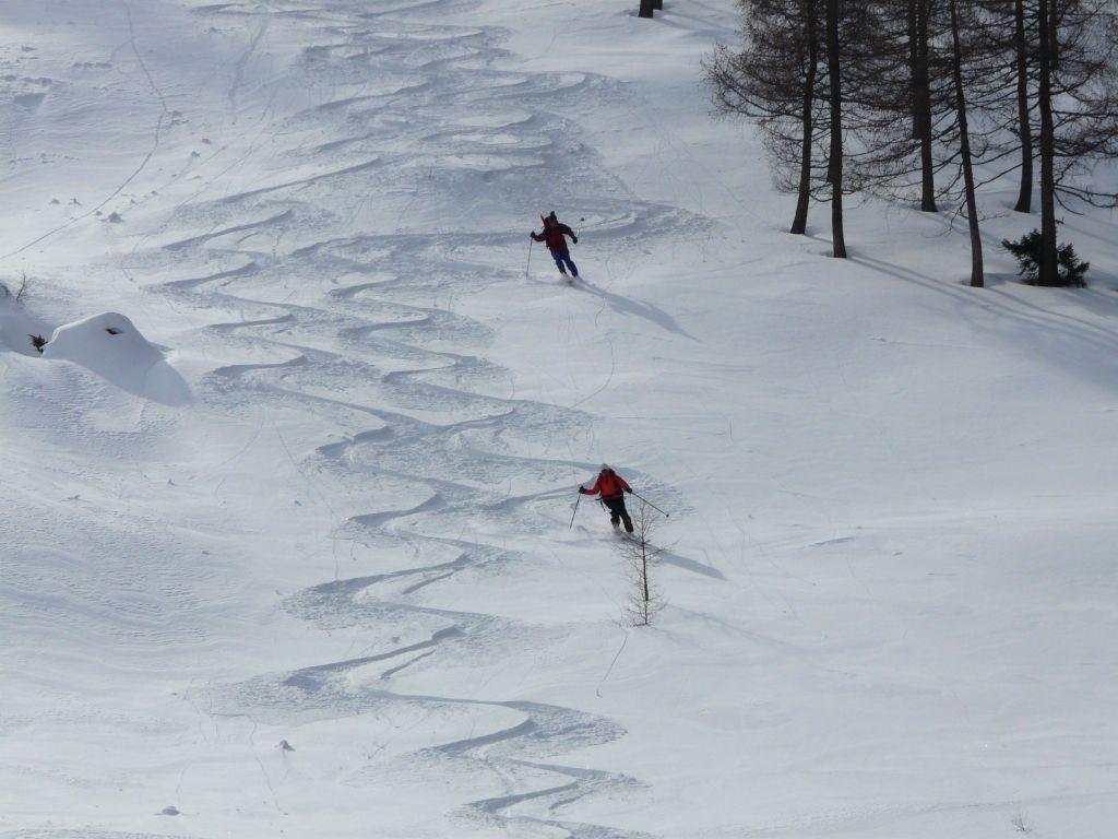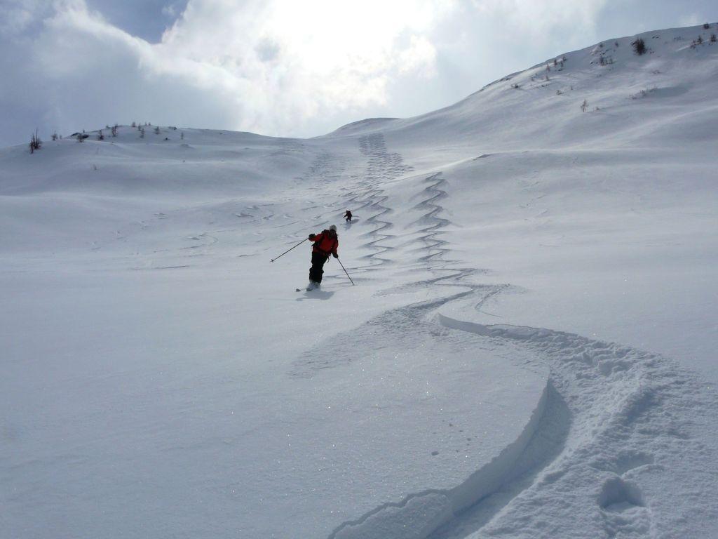 Trotz allem gemütliche Tour mit unverspurter Traumabfahrt - über 1500m Höhe 30-50cm Pulver auf tragfähigem Harschdeckel, der offenbar ohne Windeinfluß gefallen ist und bisher auch durch den heute stürmischen Wind wenig beeinflußt wurde.