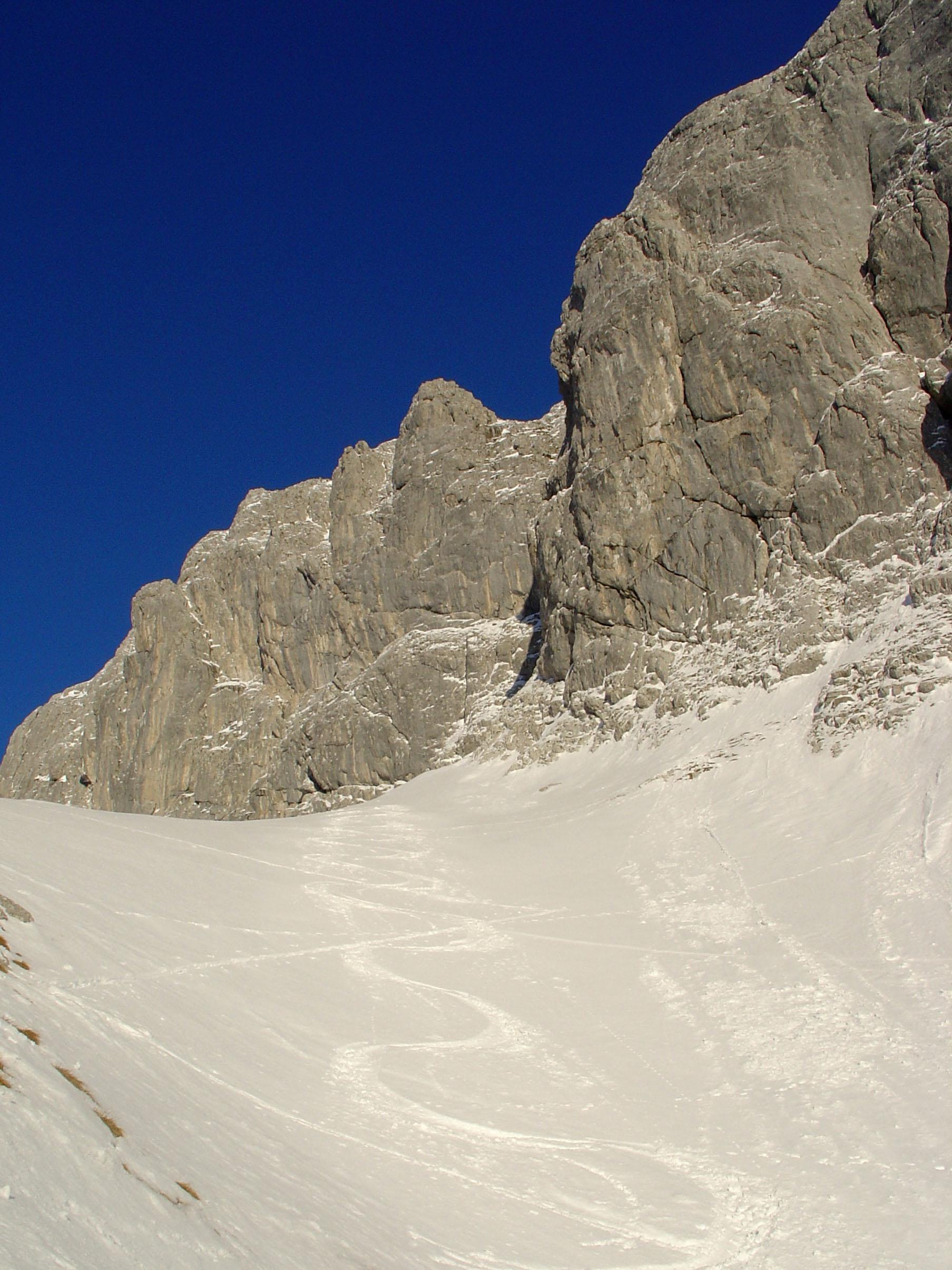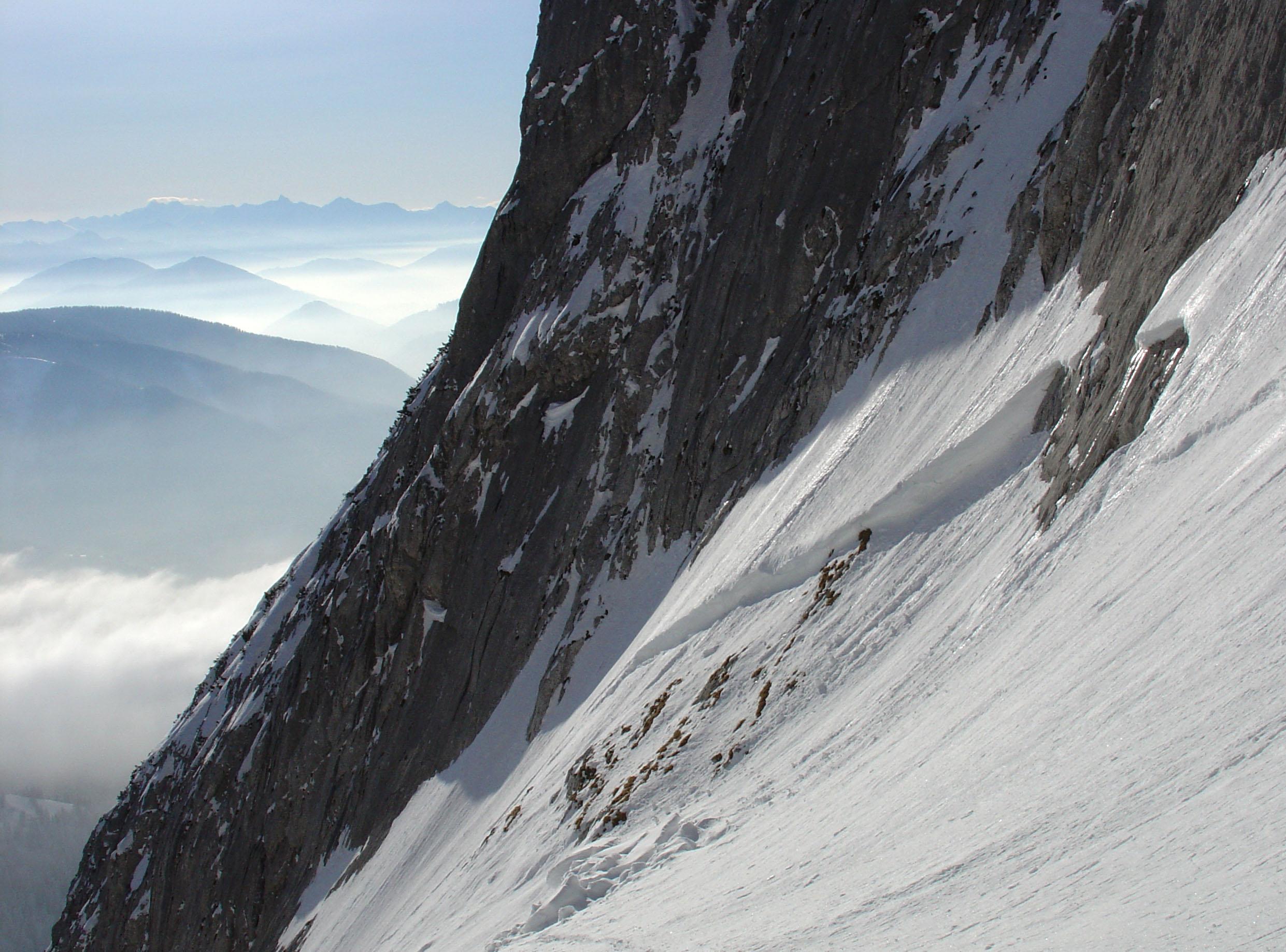 Schneedecke an der SW-Seite des Gosaukamms relativ gut gesetzt ( Sonneneinstrahlung ) Am Latschengürtel oberhalb der Stuhlalm zu wenig Schnee. Beim Einstieg der Wahnsinnsplatte am Glatscherofen brach oberhalb des Schwimmschnees Anfang Februar ein trockenes Schneebrett durch Selbstauslösung los.