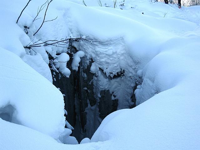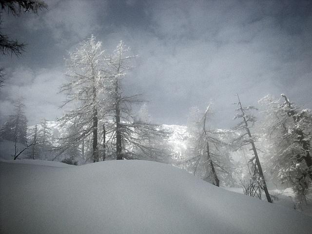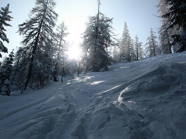 Schneebeschaffenheit: Auf einer relativ leicht störbaren Harschschicht (darunter grobkörniger Schwimmschnee) auf Grund der nordseitigen Lage Pulver.