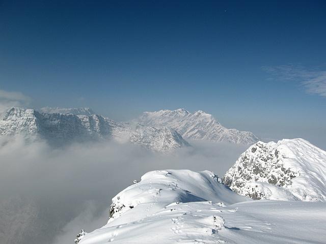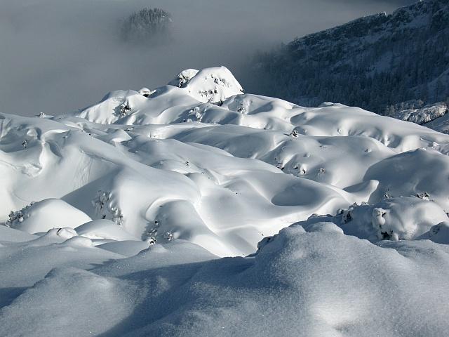 Die Nebeldecke reichte bis ca. 1500m. Trotz der letzten Schneefälle sind noch nicht alle Latschen eingeschneit, Dolinen teilweise offen!