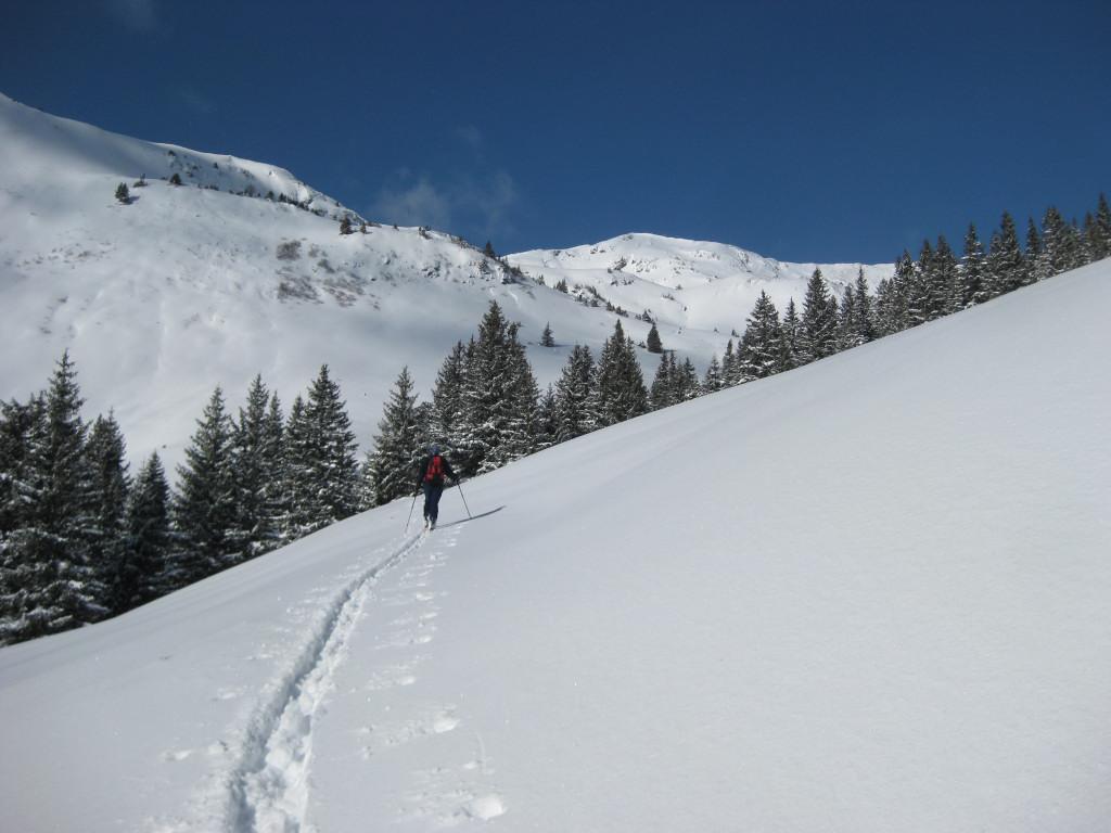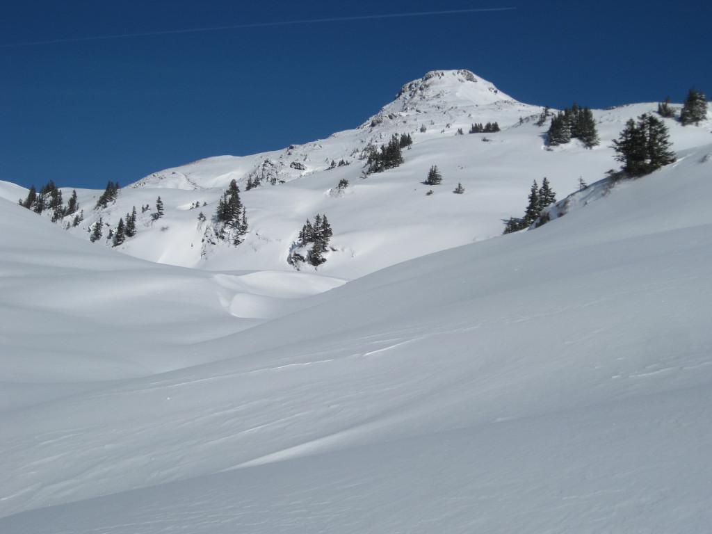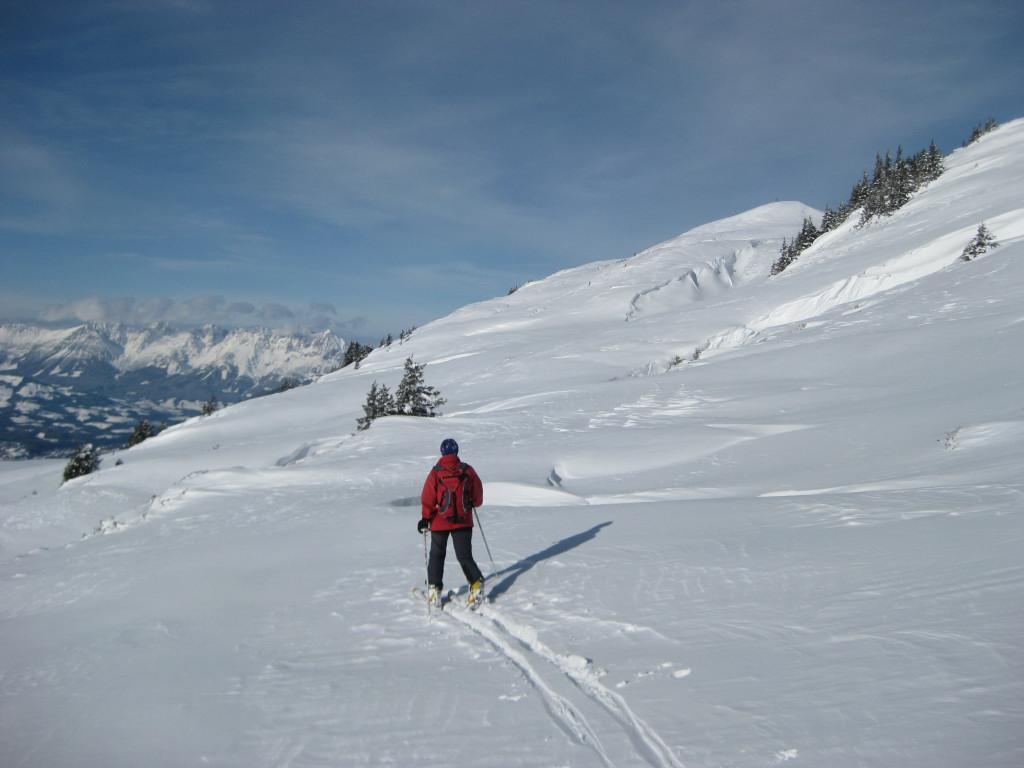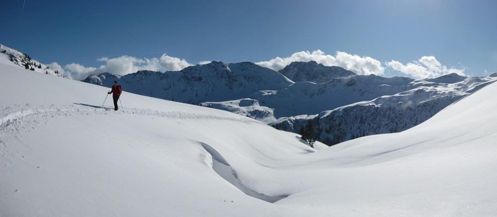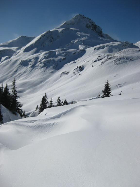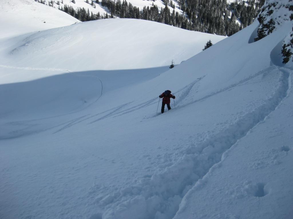 Einsame Tour über Ossmanalm und Saaljoch zu Rauber und Saalkogel - die Spuren der Pulverabfahrten des Wochenendes sind nur mehr an abgeblasenen Rücken schemenhaft erahnbar. Gewaltige Einwehungen und weitreichende Schneedeckenspannungen prägen die Tour: so viele Setzungsgeräusche haben wir bisher noch nie gehört. Nur eine sehr defensive Spurwahl erlaubt das Ziel zu erreichen. Die Westseite über dem Saaljoch ist entweder abgeblasen oder windgepreßt.