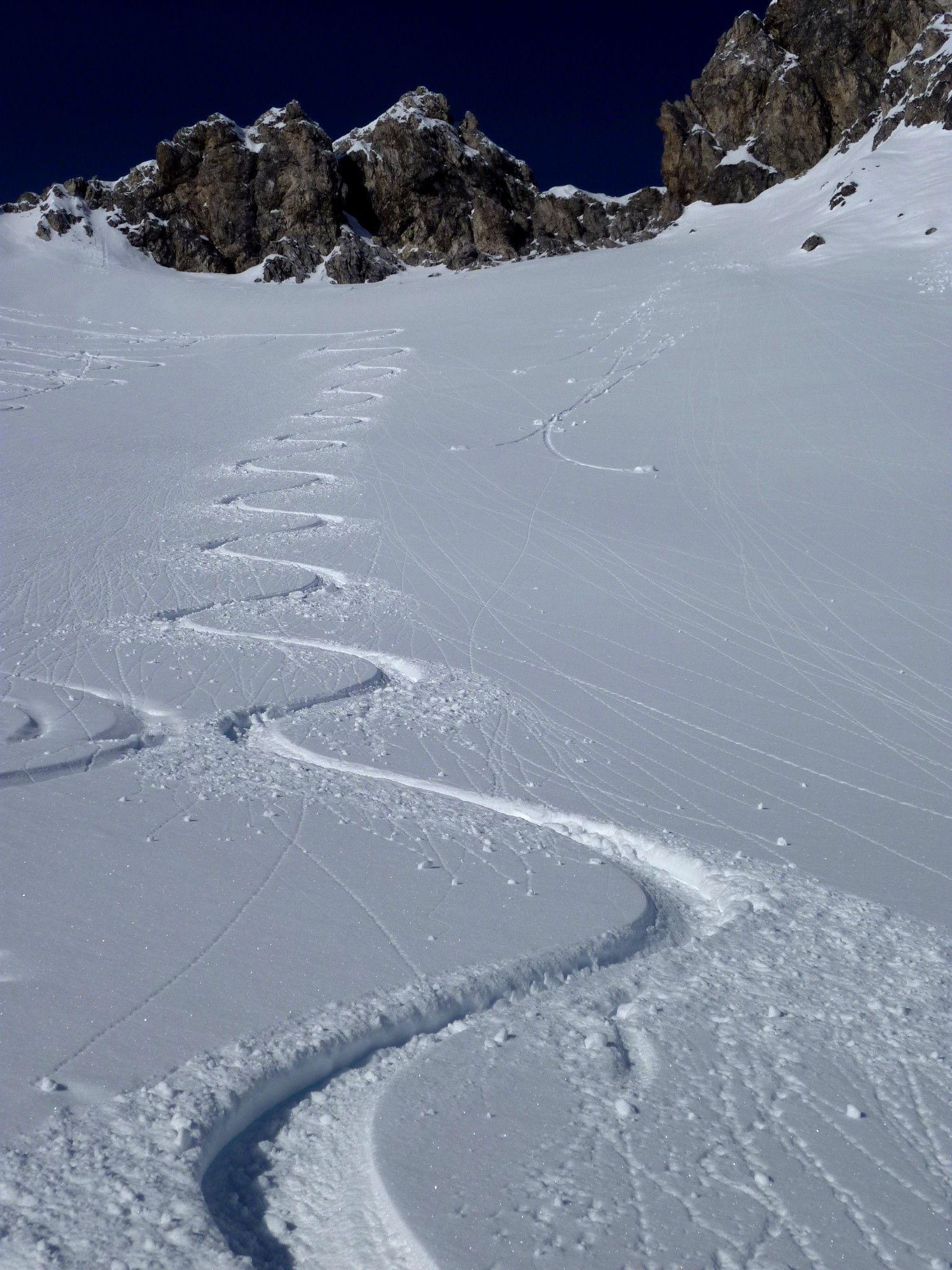 Rettenwand über die Muhrer Alm. Steile südseitige Hänge, ca. 15 cm leicht angefeuchteter Schnee auf tragfähigem Untergrund.