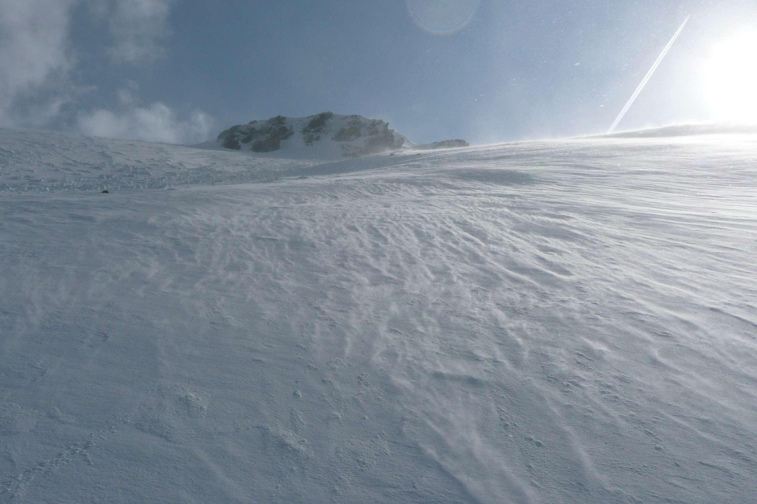 Nach nächtlichen Niederschlägen mit etwas Neuschnee oberhalb von ca. 2100 m klarte es mit stürmischem Wind rasch wieder auf. Mit dem Auto von Innervillgraten über Hochberg auf ca. 1750 m, dann über die Kameliesenalm in die W-Mulden, die zum Gipfel leiten. Der kräftige Wind hielt tagsüber länger an und brachte wiederholt dichte Wolken im Gipfelbereich, bevor es sich am Nachmittag endgültig ausputzte.