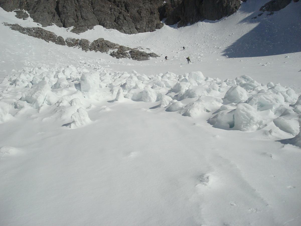 aufgeweichte aber noch kompakte Schneedecke nach bewölkter Nacht; viele Lawinenknollen, Sekundärrinnen und Spalten;