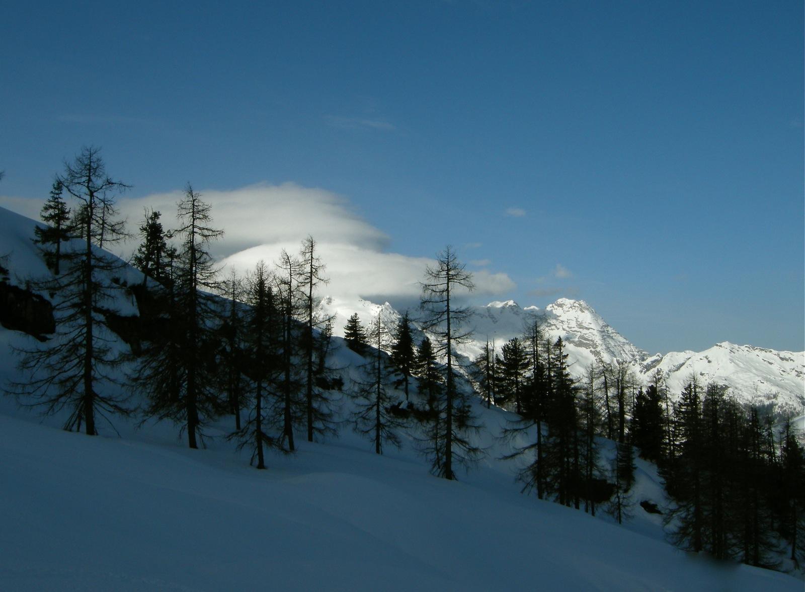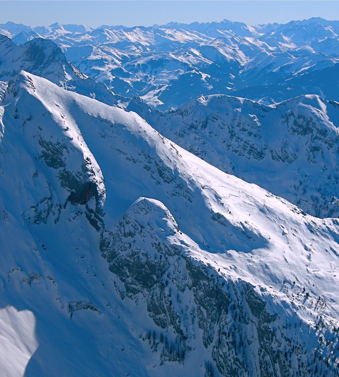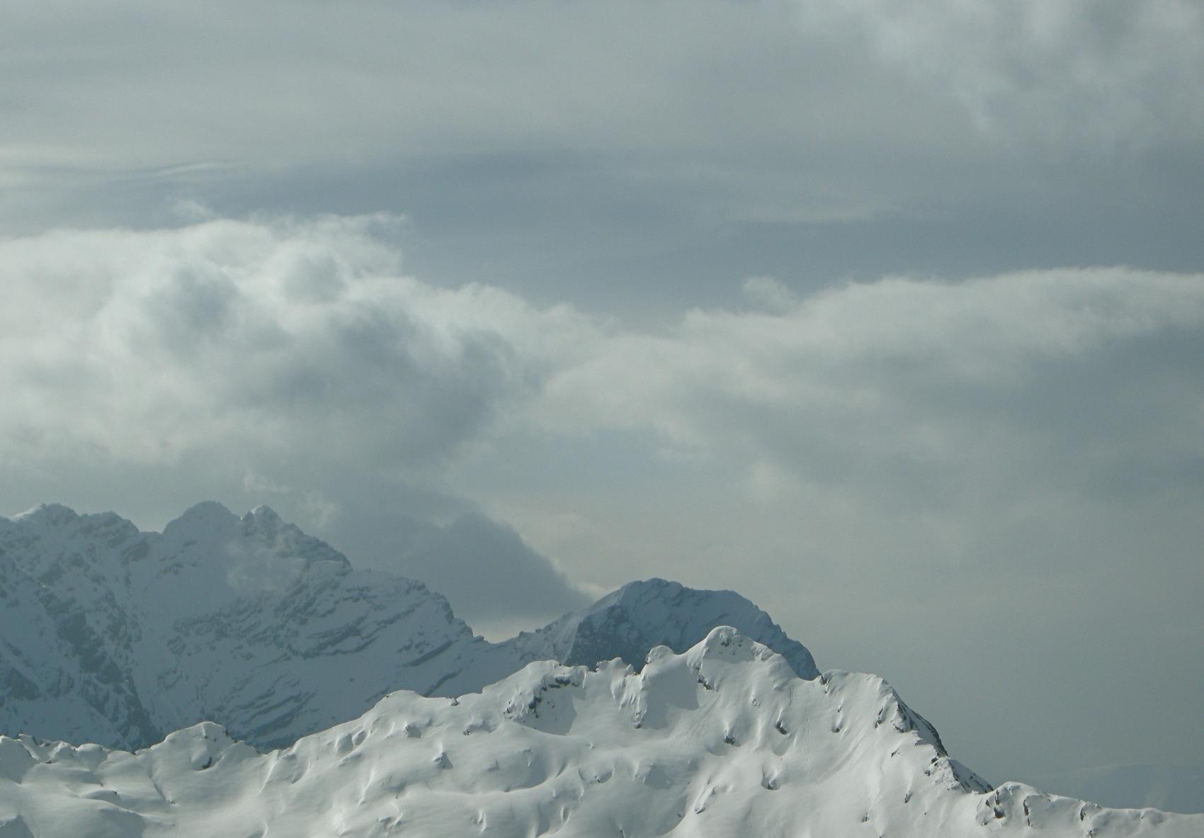 Bis zum Gipfel hinauf ist der Schnee von den warmen Temperaturen umgewandelt und oben noch hartgefroren. Der Föhnsturm bläst heute stark und jagt mich schnell wieder hinab.