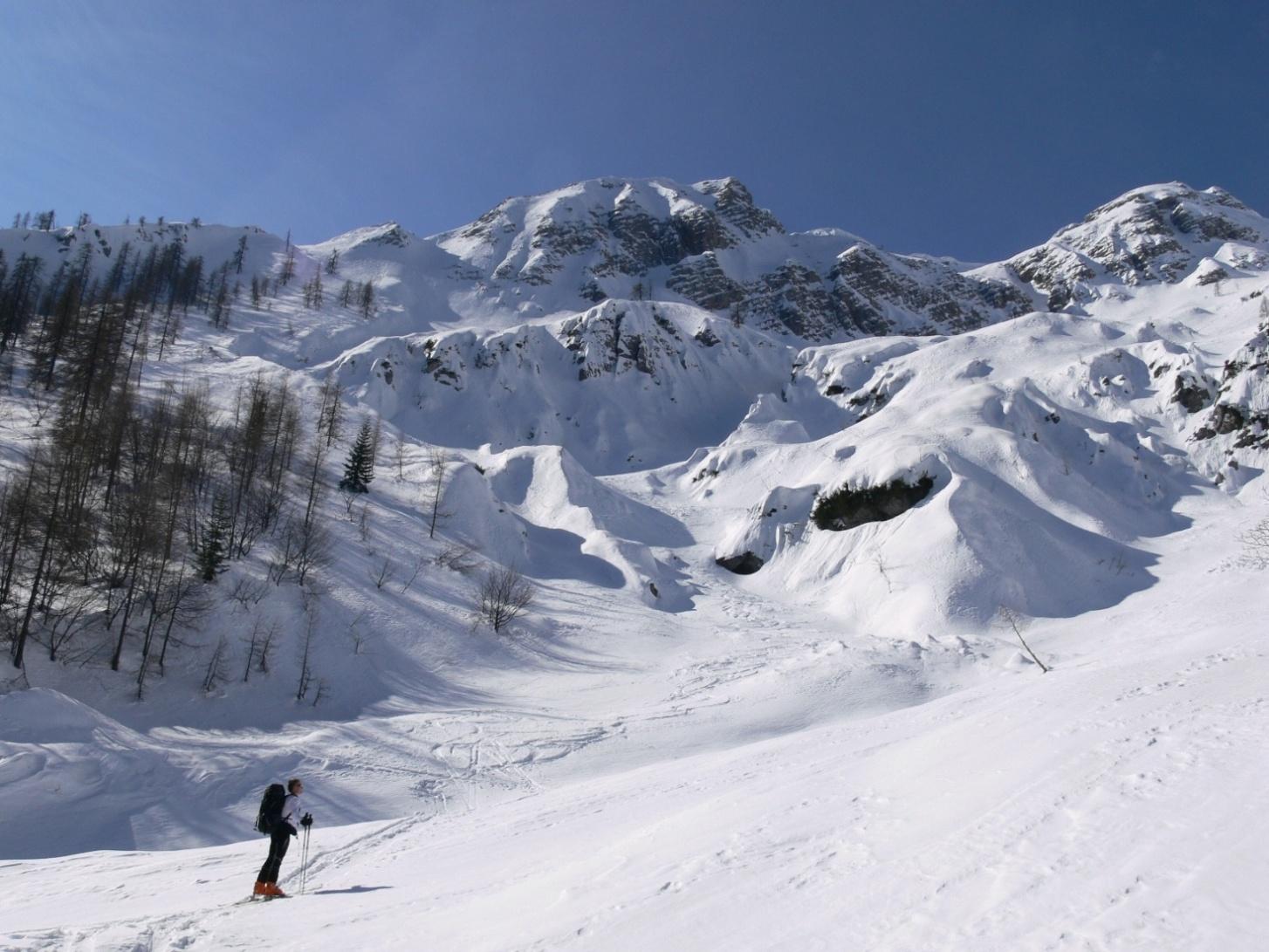 Aufstieg entlang des Forstweges bis unter die Berta-Hütte; dann hoch oben im Kar entlang bis zum südostseitigen Aufstieg (Sommerweg) zum Gipfel. Herrlicher Rundblick!!! Die Schneeverhältnisse wechselten zwischen Bruchharsch, windgepreßt und Sulz.