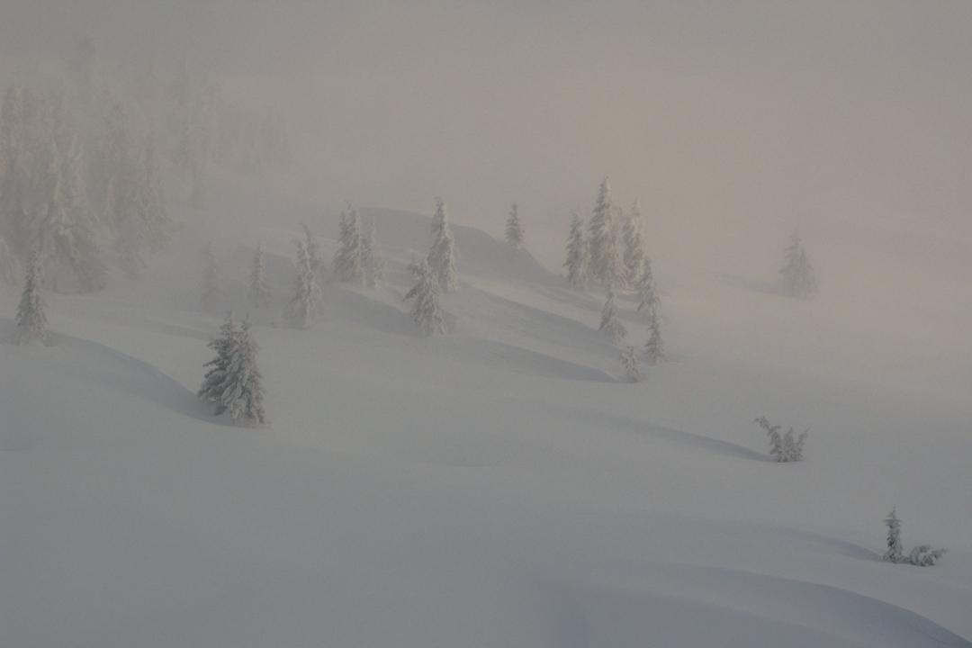 Und nach 2 Stunden knietiefem Spuren zeigte Zeus ein wenig Mitleid und ließ ein paar schüchterne Sonnenstrahlen durch die kompakte Wolkendecke, bevor mich Wind, Kälte und dichtes Schneegestöber wieder Richtung Tal jagten.
