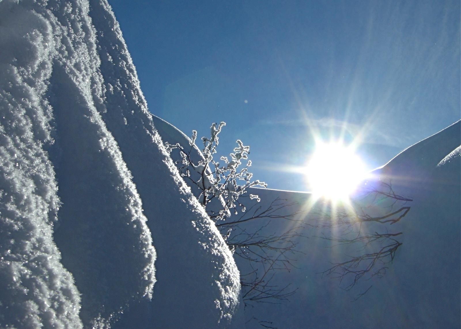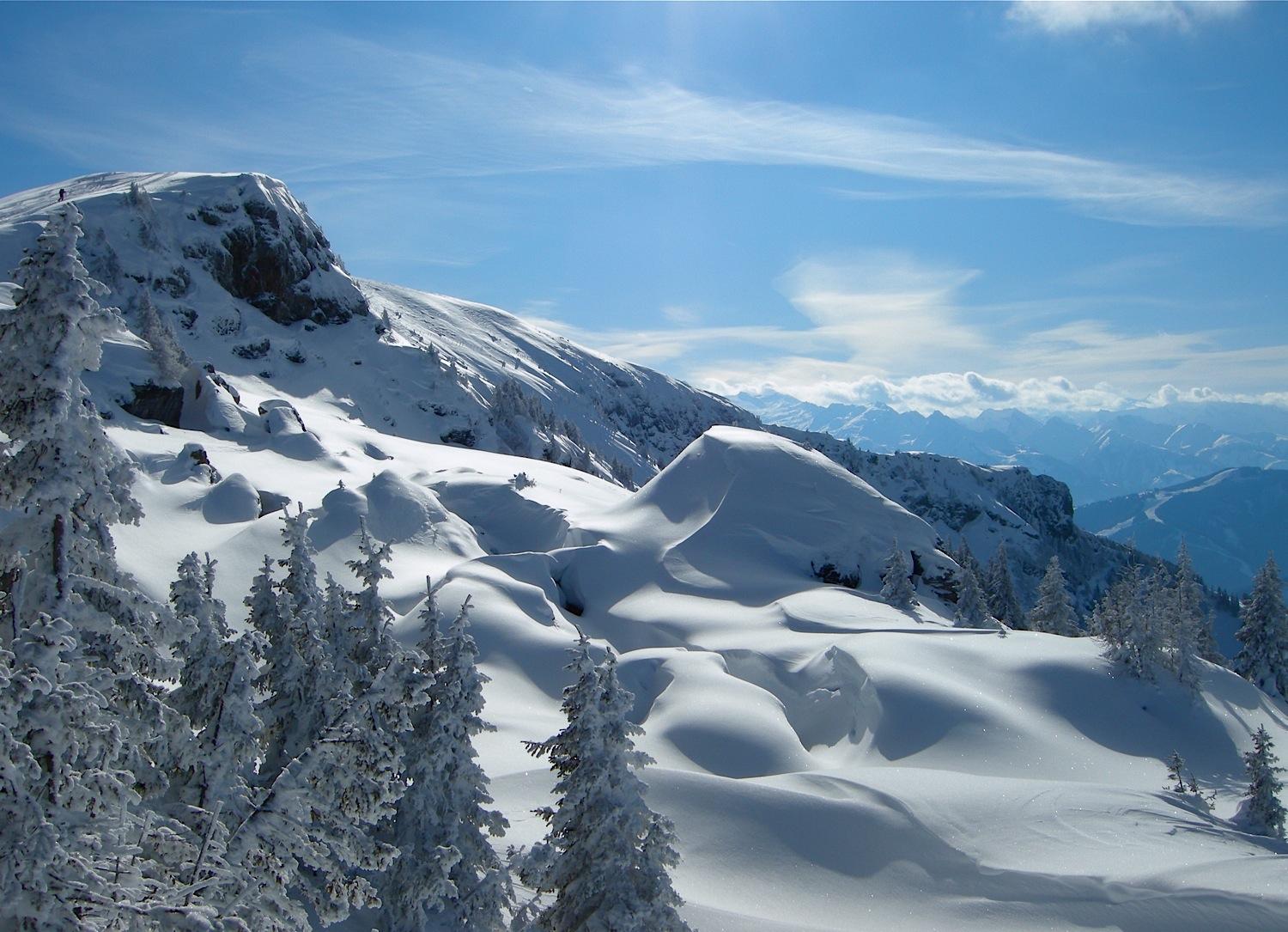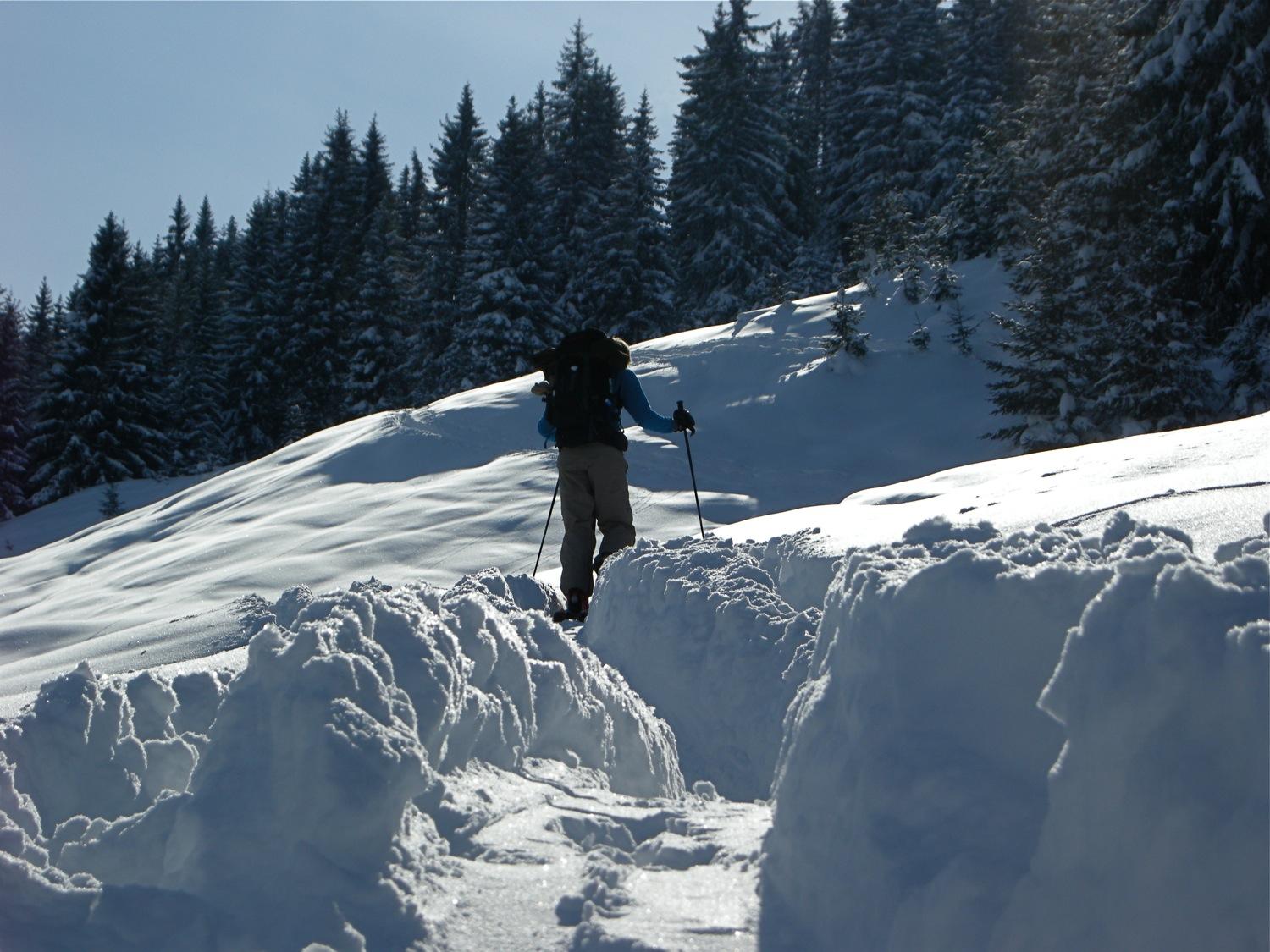 Tief ist der Schnee, locker und weich, bis sich am Kamm alles verblasen und windgepresst zeigt.