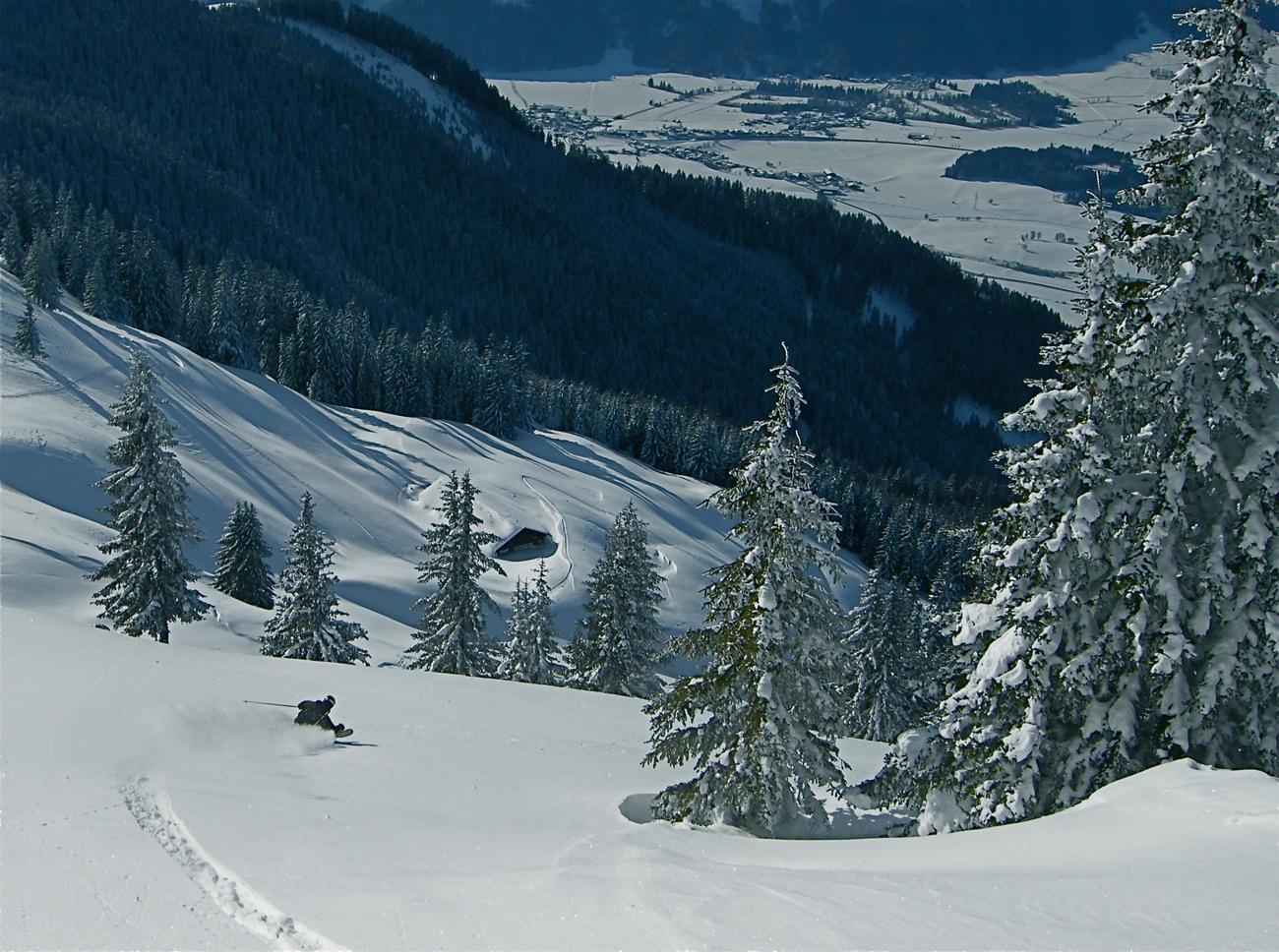 Bald sind wir über´n Berg und fahren ab nach Westen, ziehen weite Schwünge in den Tiefschnee hinab zur Dickalm.
