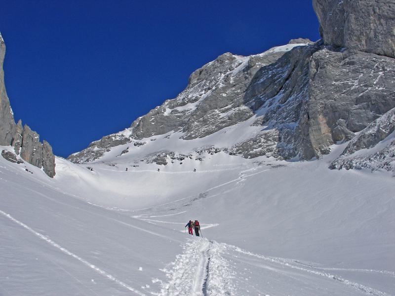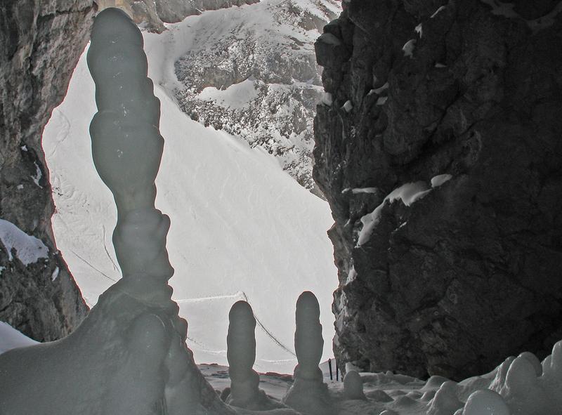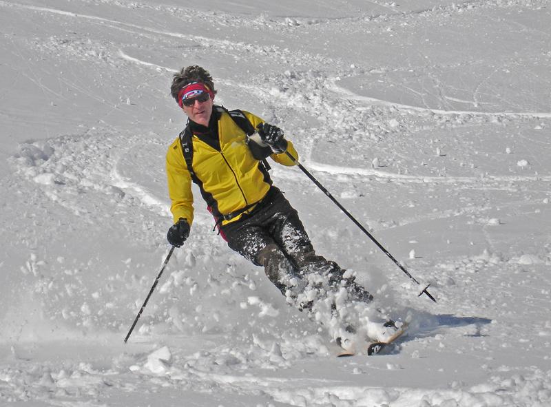 Nicht ganz gesund, die Beine wie Blei, trotzdem vor Wetterwende noch hinaus. Mit Fred Richtung Tauernscharte, der Neuschnee hält sich hier in Grenzen--so zwischen 10cm bis 15cm-- die Altschneeschicht hart und ruppig, Fahrvergnügen fordert Kraft. Beim "Sanatorium" , ein nettes, sonnigs Plätzchen, ist für mich Endstation; Besuch in der Halbhöhle des Napfs.