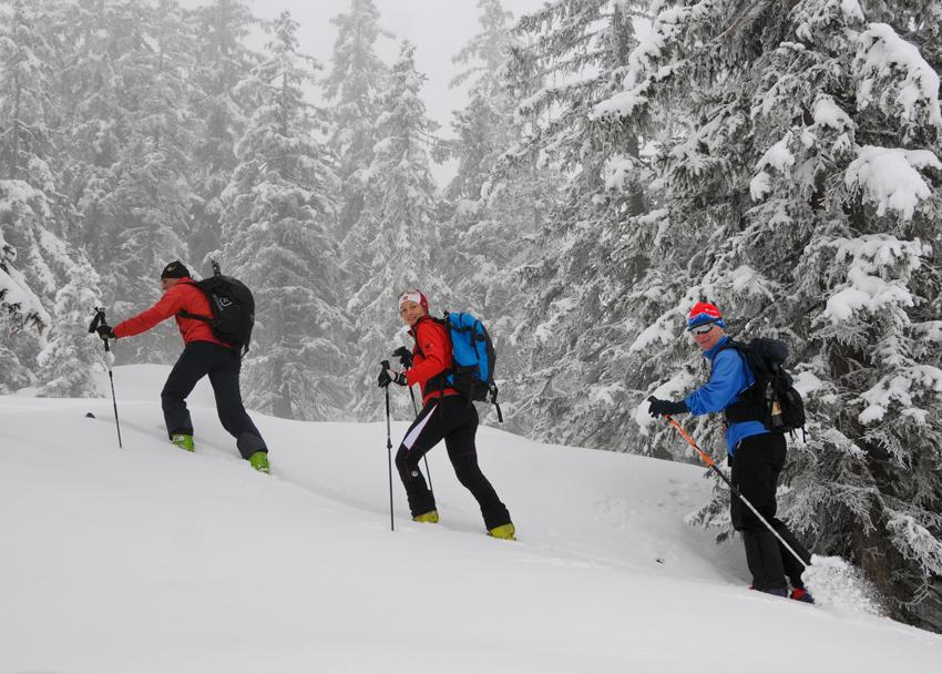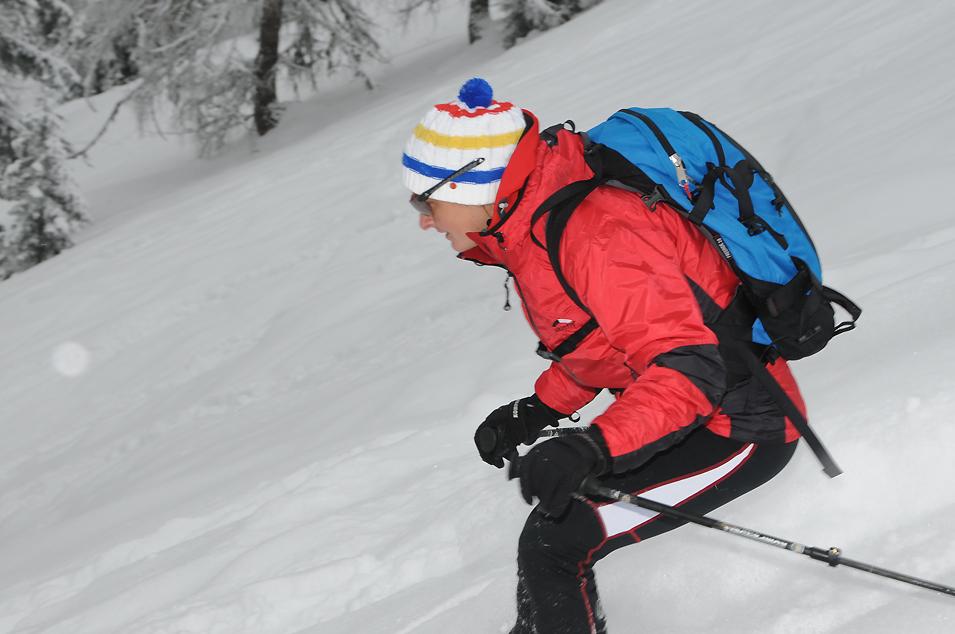 Die anschließende Abfahrt vom Haus über die Falzalm hatte es bei dichtem Nebel wirklich in sich, wobei die ca. 30cm Pulverschnee eigentlich sehr gut zu fahren waren. Was fehlt, ist aber eine ausreichende Unterlage. Die Abfahrt sollte man wegen Schneemangel im unteren Teil auf die Forststrasse verlagern, auf der man dann bis zur Wimbachbrücke abfahren kann.
