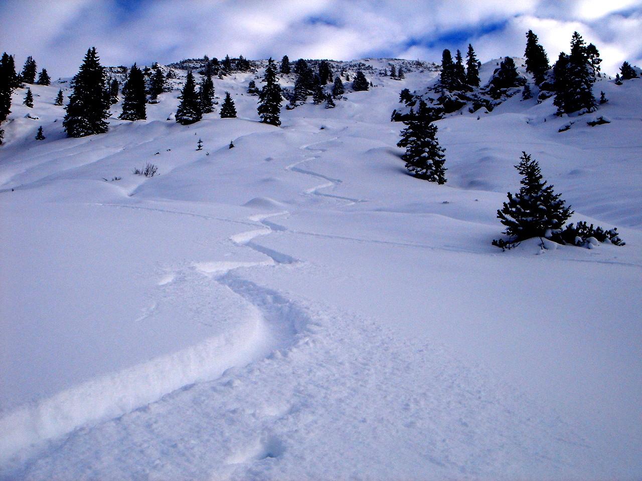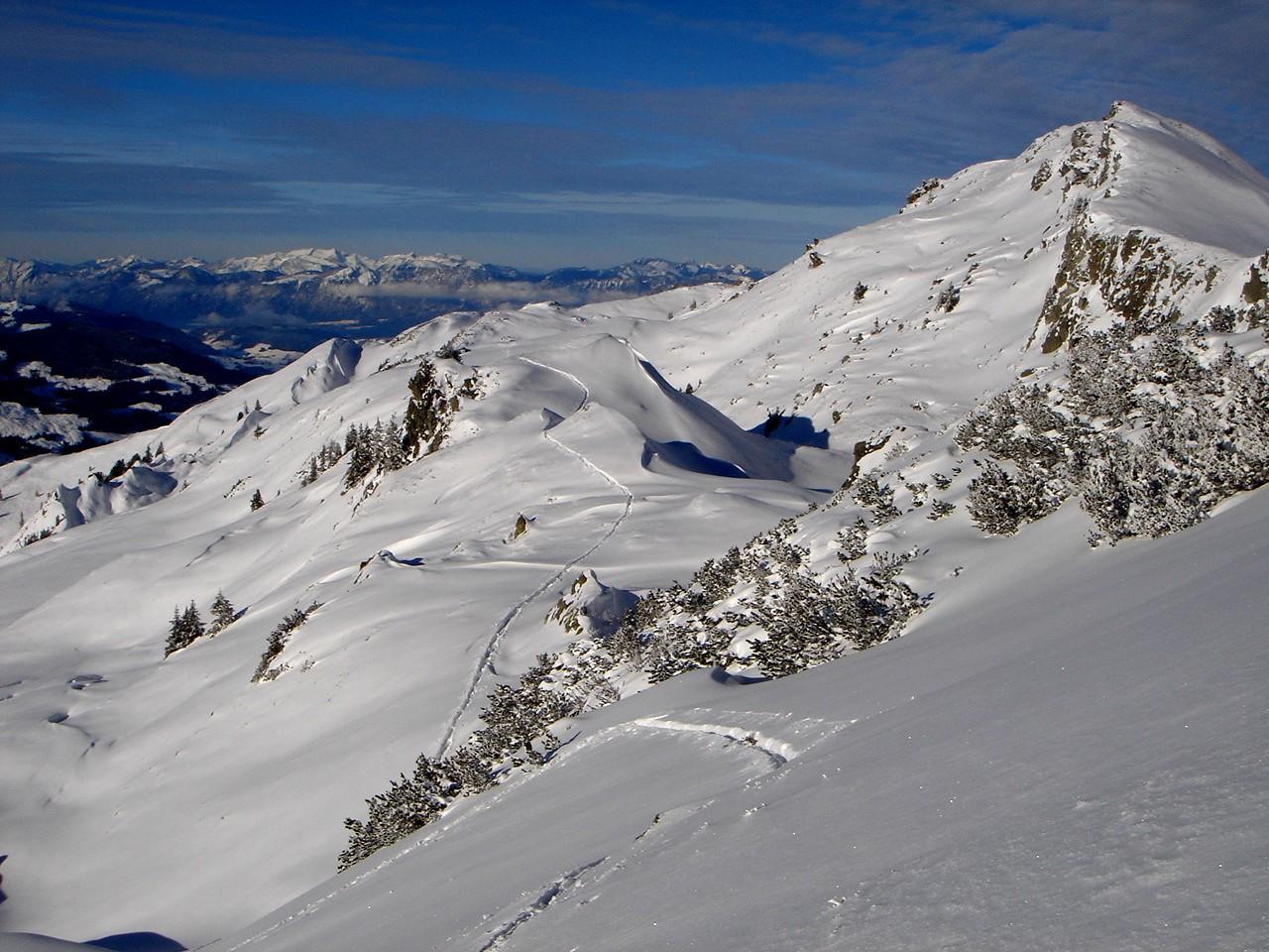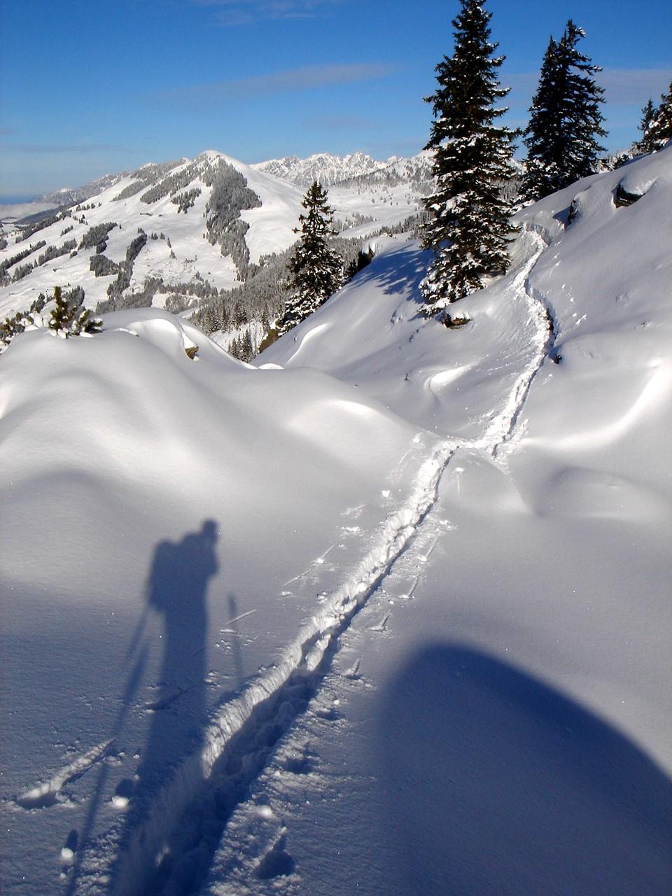 Aufstieg vom Gasthaus Steinberg, Neuschnee 20 cm Tal/30 cm Berg auf wechselndem Untergrund. Viel Spurarbeit. Von dieser Seite kein Mensch unterwegs! Insgesamt sehr schöne Abfahrt.