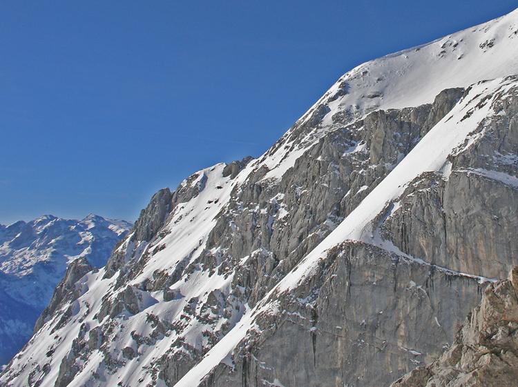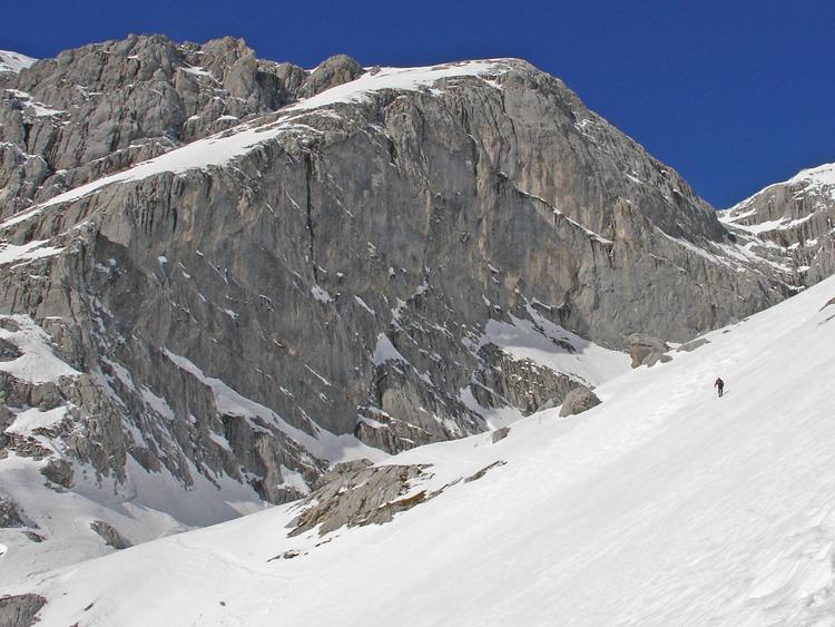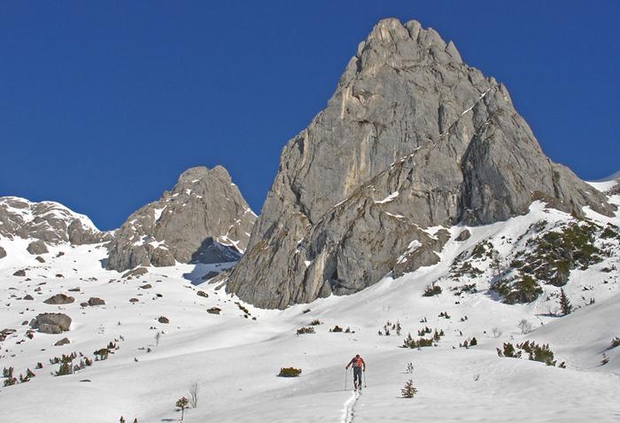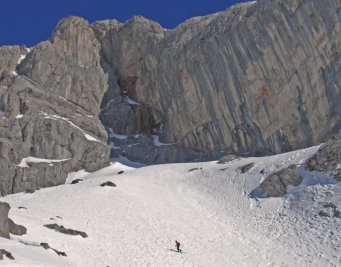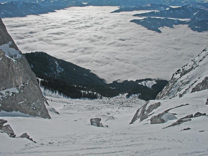 Der Nebel hielt sich heute hartnäckig, Nebelgrenz im Tennengebirgsbereich Süd so um 1100 m, sonst beinahe wolkenlos, warm. Die Rumpelkammer heute im Visier, wider Erwarten recht gute und sichere Schneeverhältnisse;Firnbildung.
