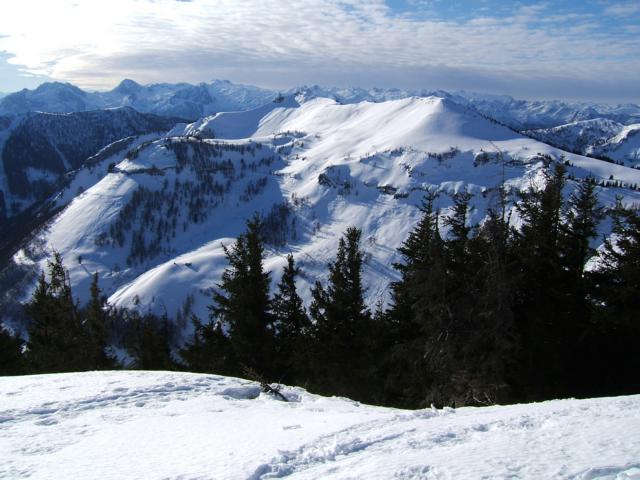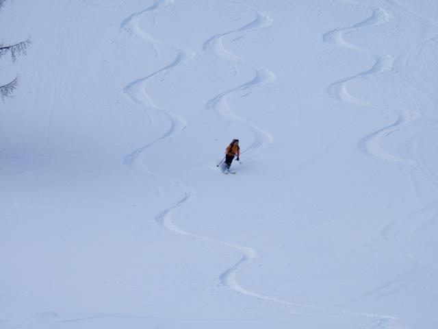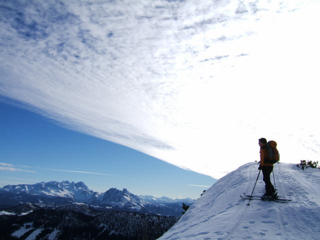 Verhältnisse: in den sonnigen Hängen beim Aufstieg z.T. Harschkruste bzw. vereiste Spur, im Kammbereich windgepresst; bei der Abfahrt vom Egelseehörndl bester Pulverschnee mit Ausnahme kurze Abschnitte im Mittelteil (Bruchharsch aber gut fahrbar);