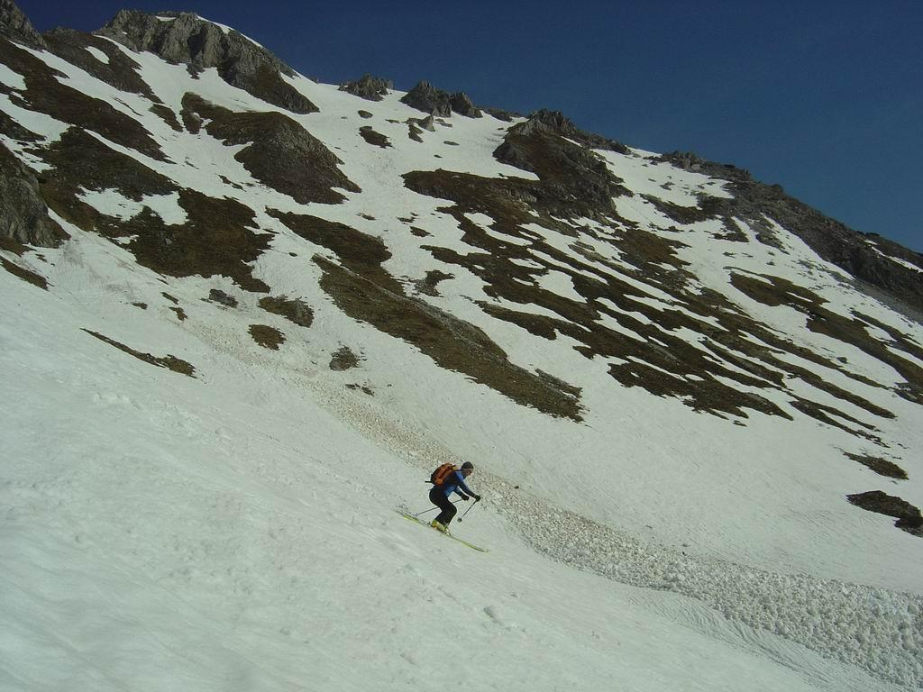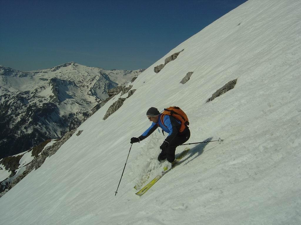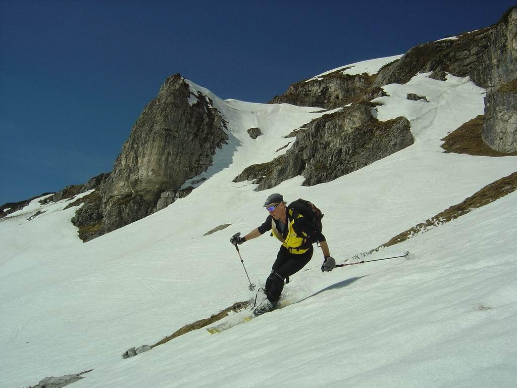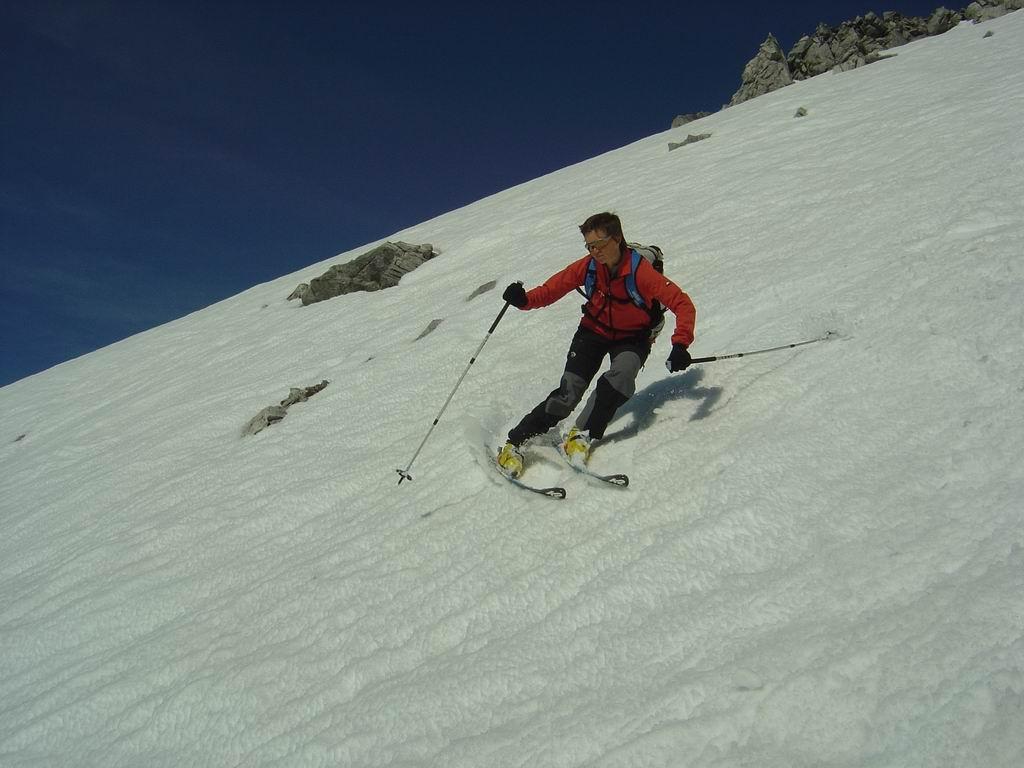 Wegen der guten Verhältnisse am Obertauern nahmen wir heute nochmals die Große Kesselspitze in Angriff. Der Anstieg erfolgte wieder durch den Schaidberggraben. Bei perfektem Firn fuhren wir heute über die herrliche Südflanke ab. Weiter gings über kupiertes Almgelände zur Gastalm. Kurz danach war dann ein halbstündiger Fußmarsch bis zur Straße nötig. Mit dem Zweitauto gings dann zum Ausgangspunkt zurück.